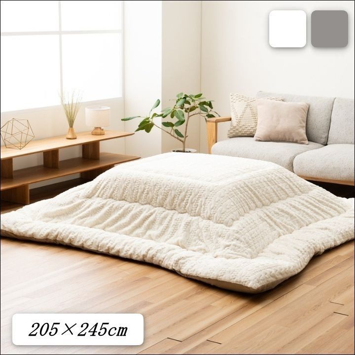 ニット風無地テイストのオシャレなデザイン。ラビットファー調の生地で滑らかなタッチ感です。日本製ボリュームこたつ布団(東レ・マッシュロン綿)仕様裏はフランネル素材で、暖かいです。