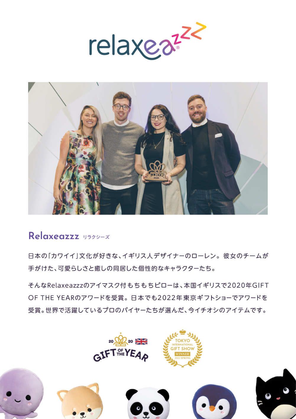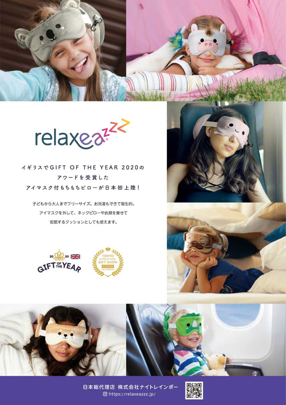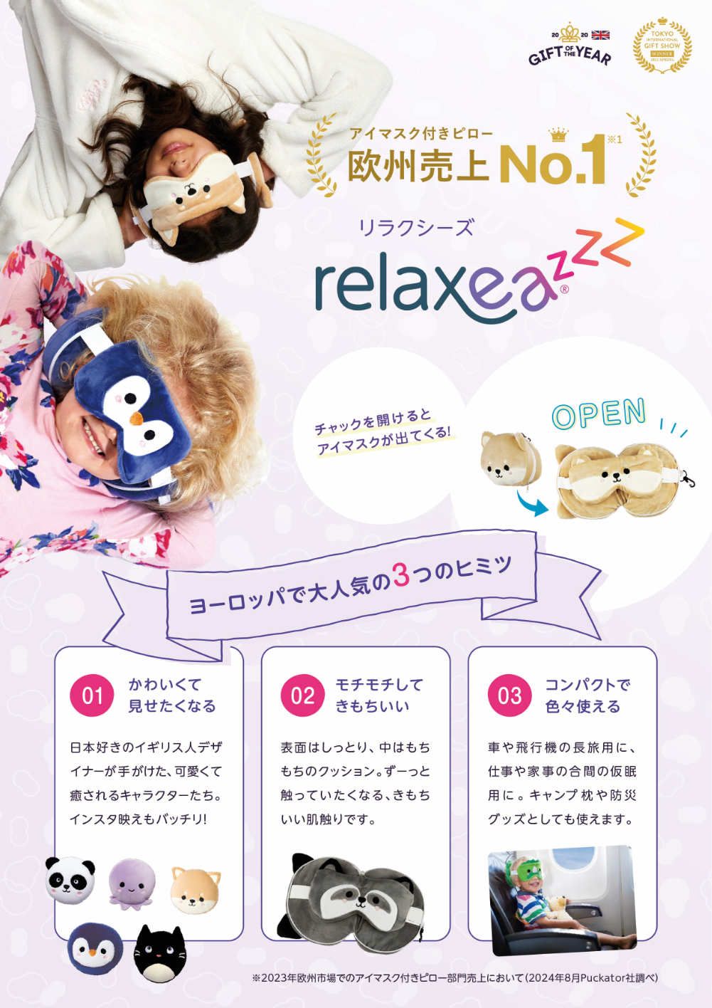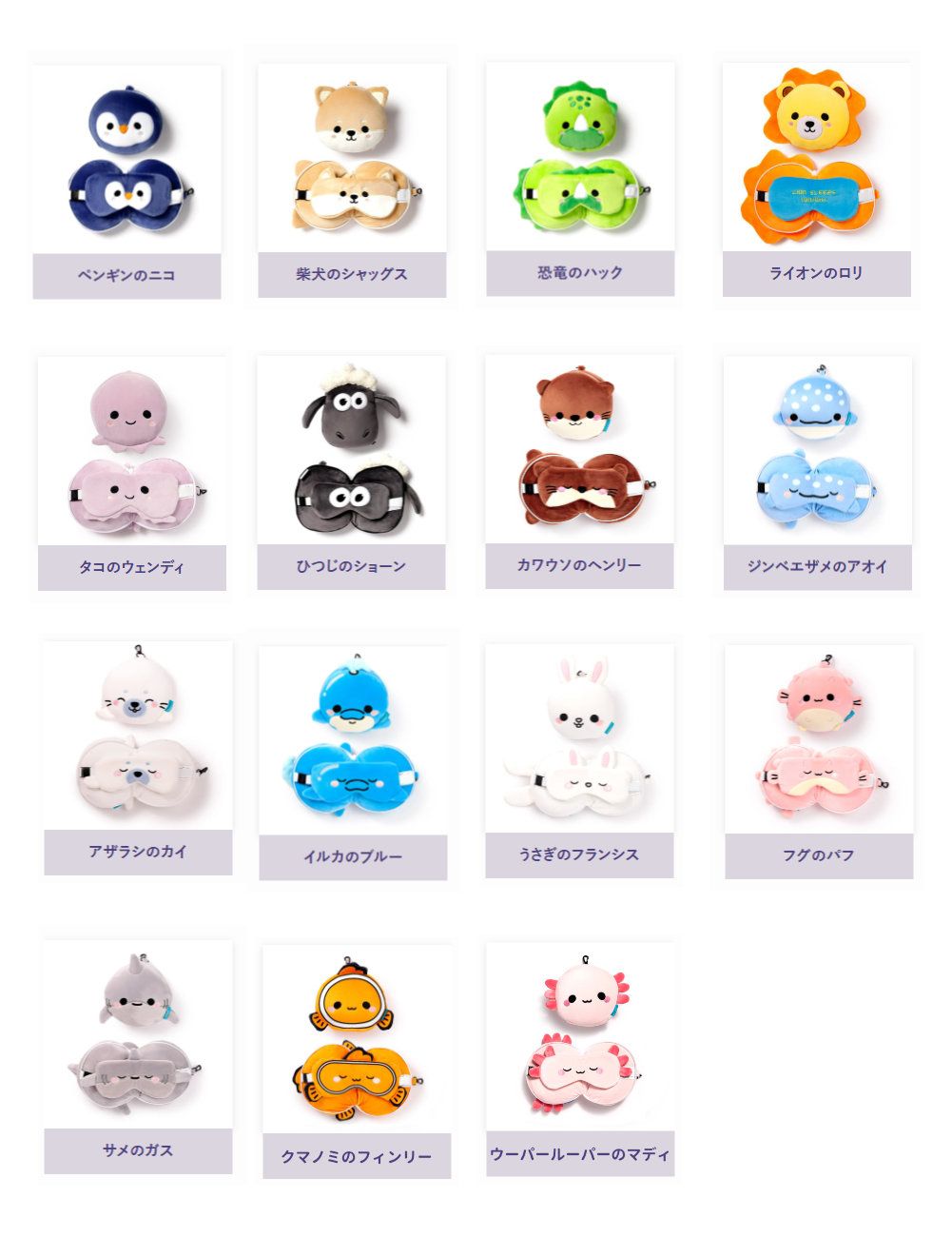 アイマスクとクッション型の携帯枕が一体型になった今までにない設計で、動物キャラクターもとってもキュート!