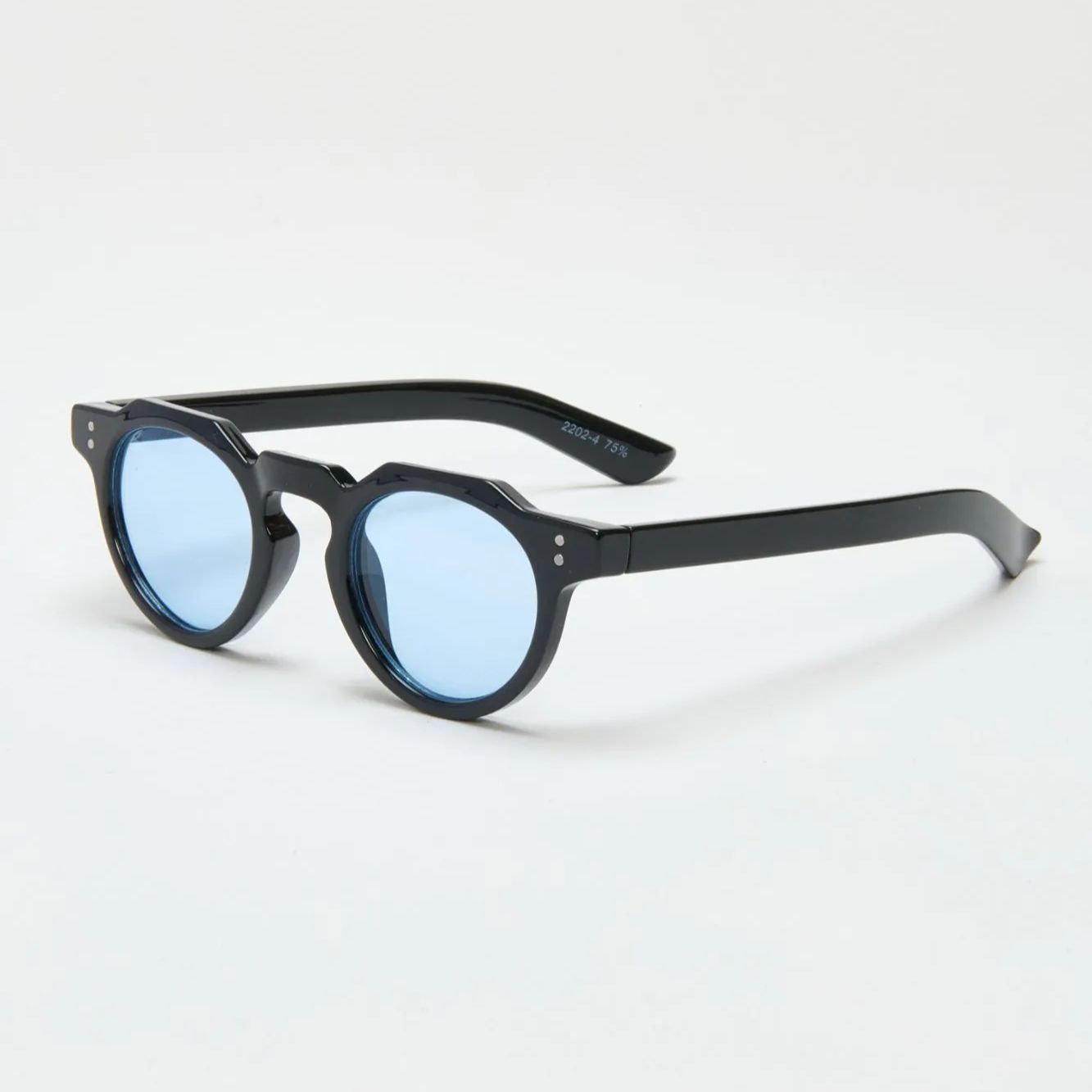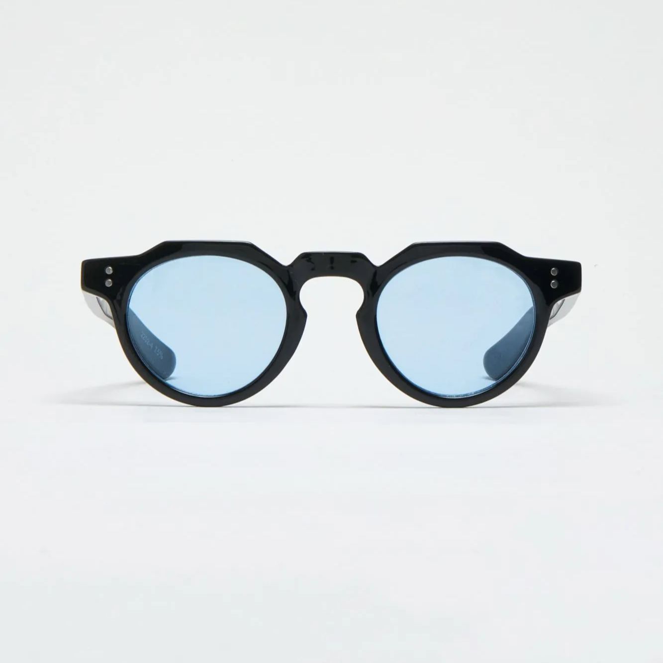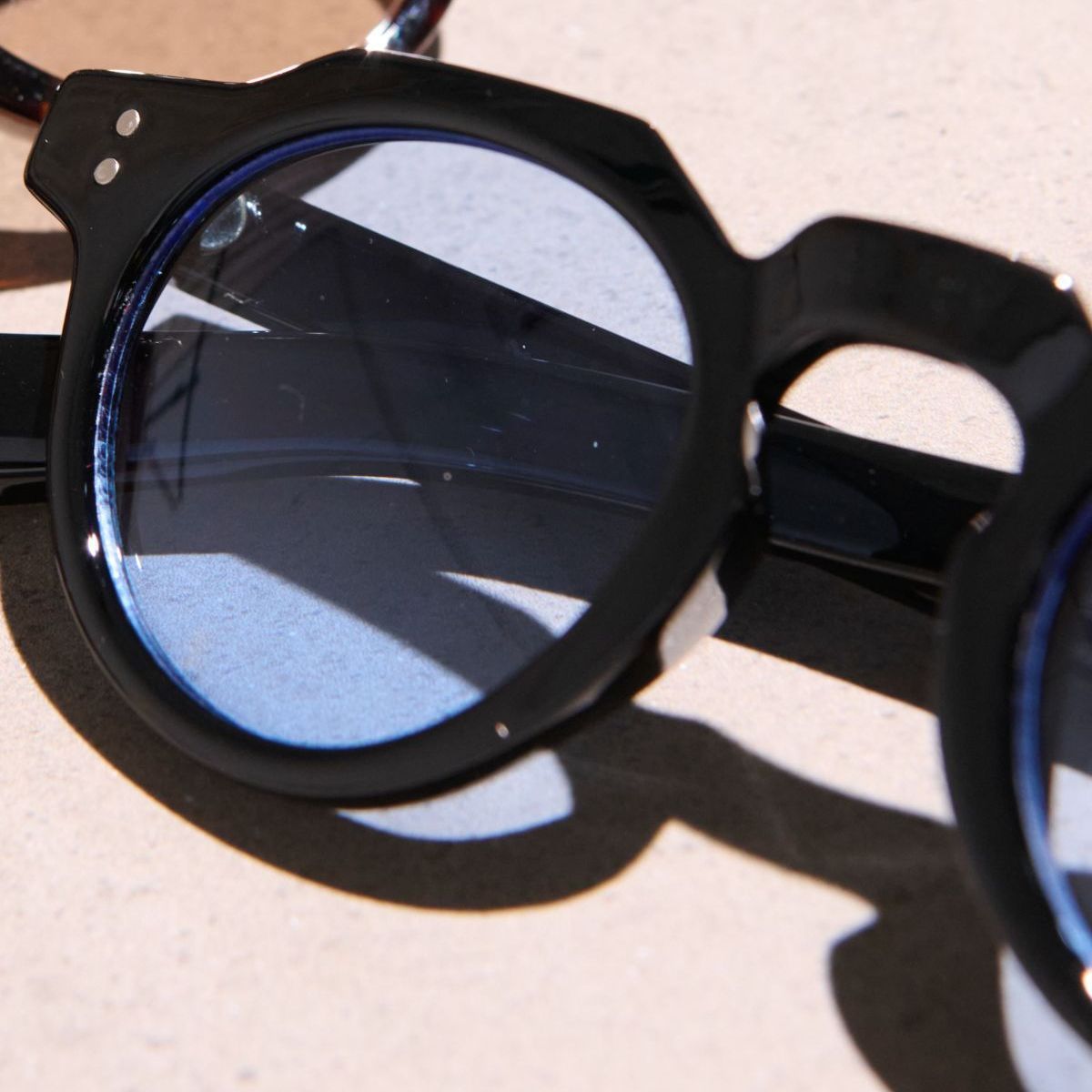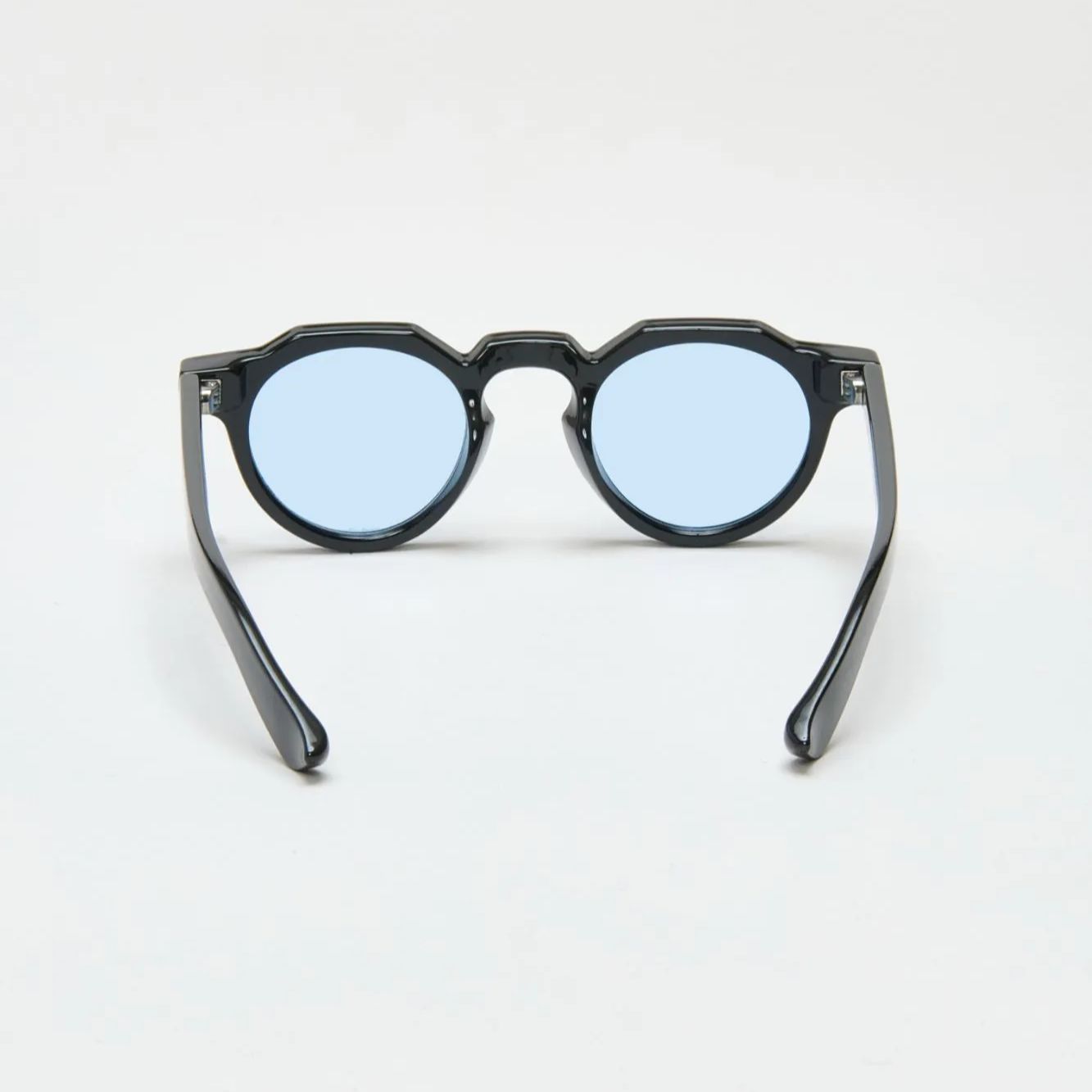 透明感あるライトブルーのレンズが視線を惹きつける、最新トレンドのラウンドサングラス。