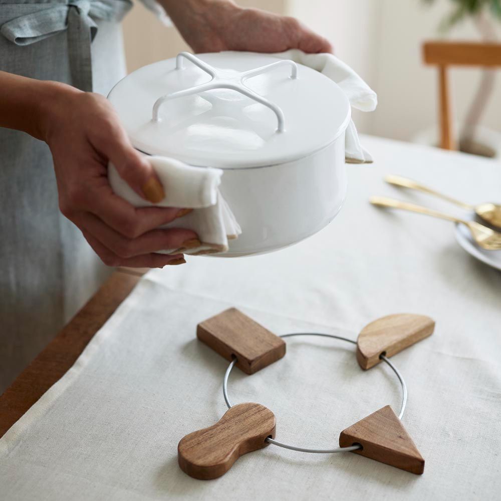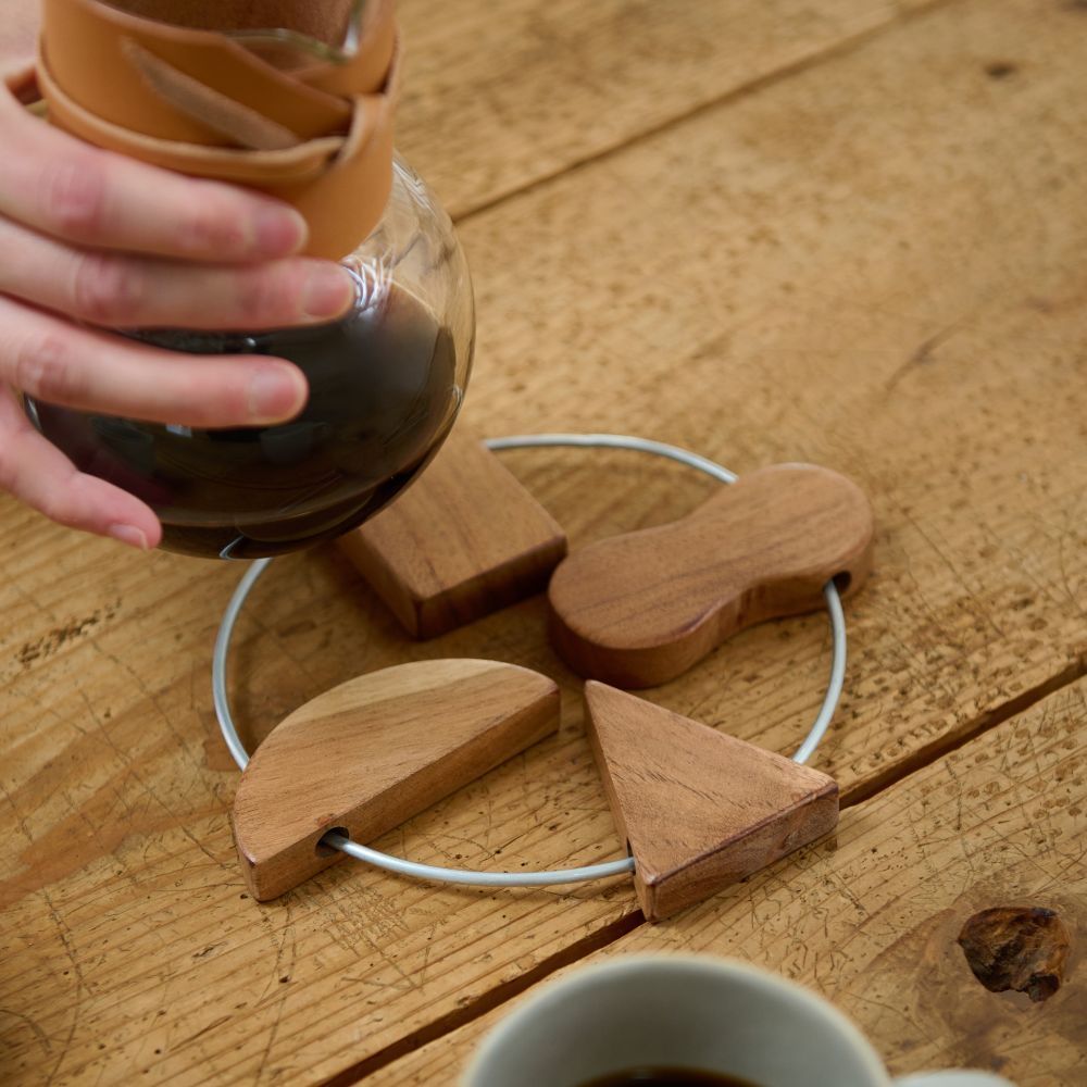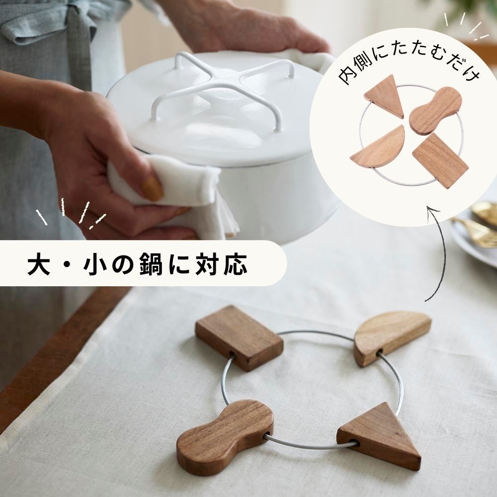 アルミと木を組み合わせた温かみある素材で作られた鍋敷き。内側に倒せばコンパクトに、外側に倒せば大きくなるので、鍋や器のサイズに合わせて使えるのがポイント。一つ一つ形が異なるモチーフがキッチンに温かみと遊び心を加えます。使わないときはリングに引っ掛けて簡単に収納でき、空間をスッキリ保てます。おしゃれで機能的なアイテムは、ダイニングやキッチンのアクセントにもぴったりです。
