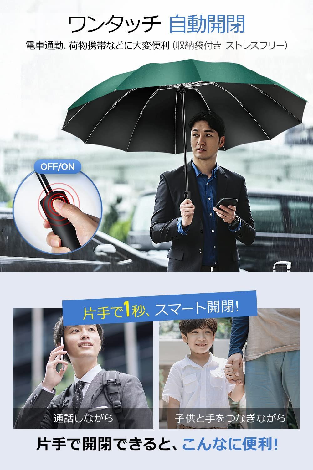 【濡れにくい大判折りたたみ傘】開いた状態で直径約108cm、曲面約118cmもある大きさで、通常の紳士傘に比べて、傘を差しながら荷物を持っていてもリュックを背負っていてもしっかりカバーしてくれて、ほとんど濡れません。体の大きな男性も窮屈さを感じることなく快適に使えます。折りたたむと長さ約32cmとなり、急な雨に備えてカバンなどに簡単に収納できます。