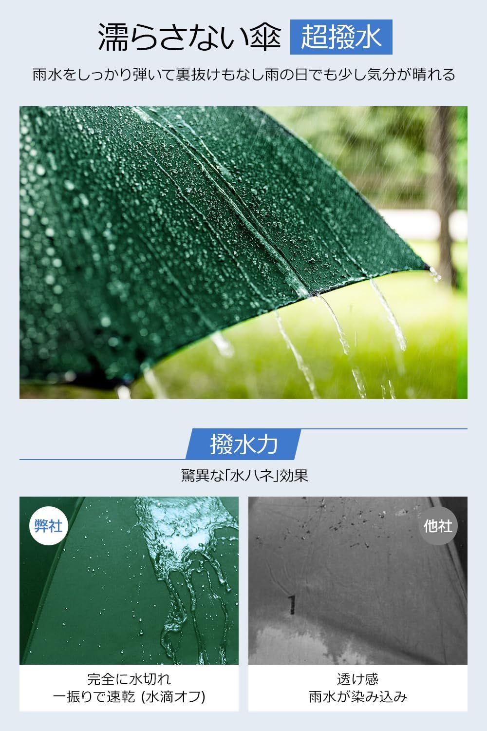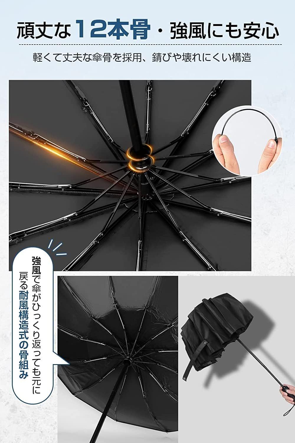【強靭な12本骨耐強風設計】柔軟性と強度を兼ね備えた12本骨を採用し、風に対する耐性と耐久性が向上しています。さらに、錆びにくい防食加工が施された傘のフレームは非常に頑丈で、強風や激しい雨にも耐えられ、折れたり曲がったりしにくい設計です。万が一強風でひっくり返ってしまっても風の力を受け流し、傘を閉じるだけで簡単に元に戻ります。風が強い日でも心強い耐風傘です。