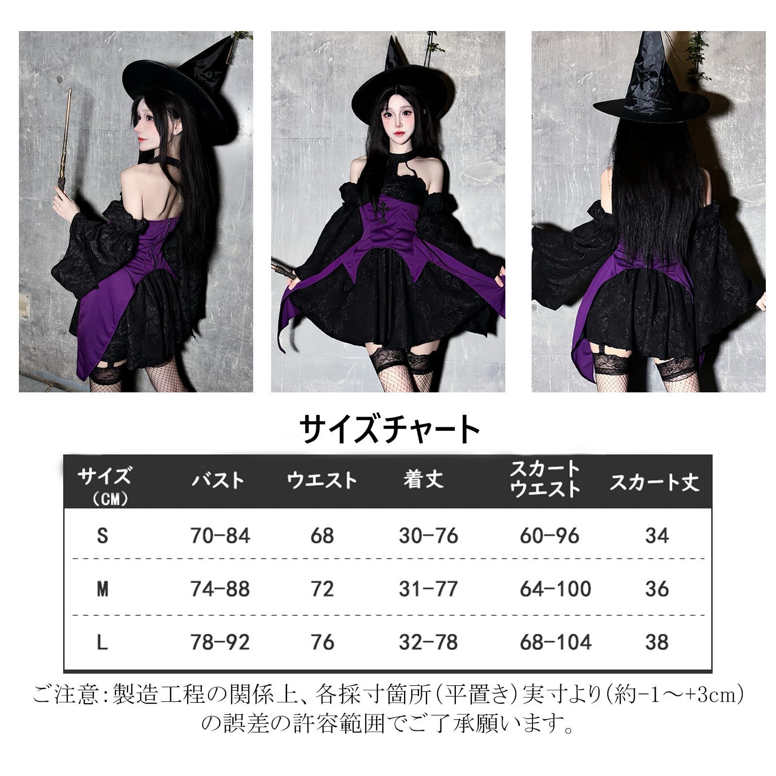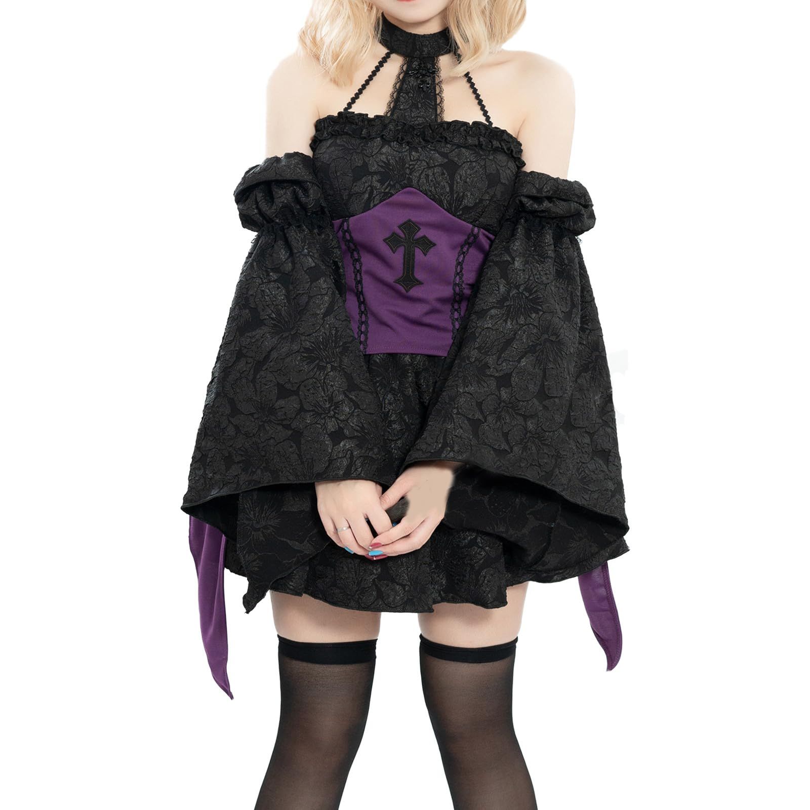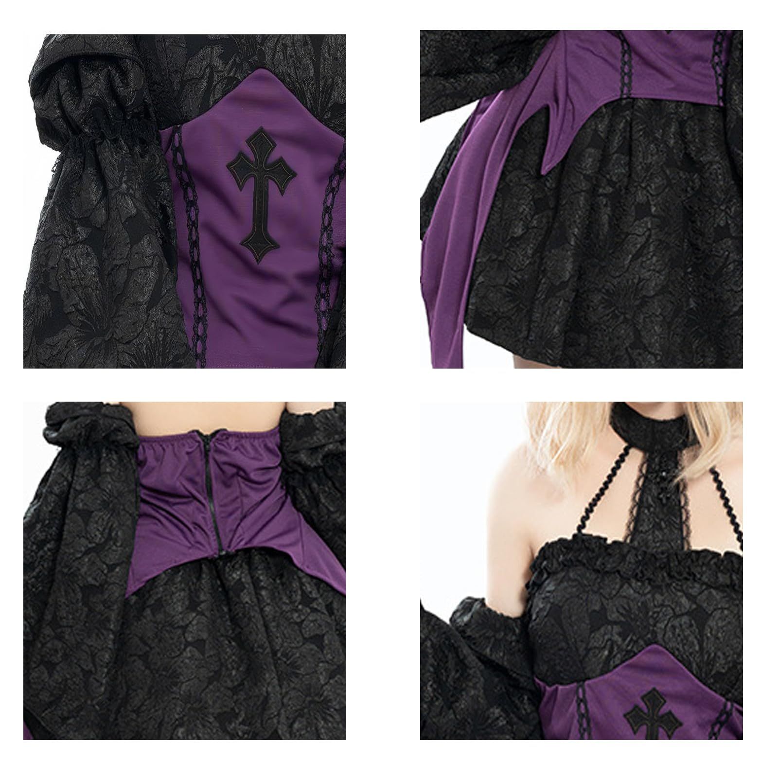 鮮やかな紫と黒の組み合わせがゴシックの神秘的な雰囲気を盛り上げてくれます。トップスはオフショルダー&首掛けで、襟元のデザインポイントを置き、メタルの飾りがついて精巧さを向上させています。背中にファスナーが付いて、伸縮性あって楽々と着脱。