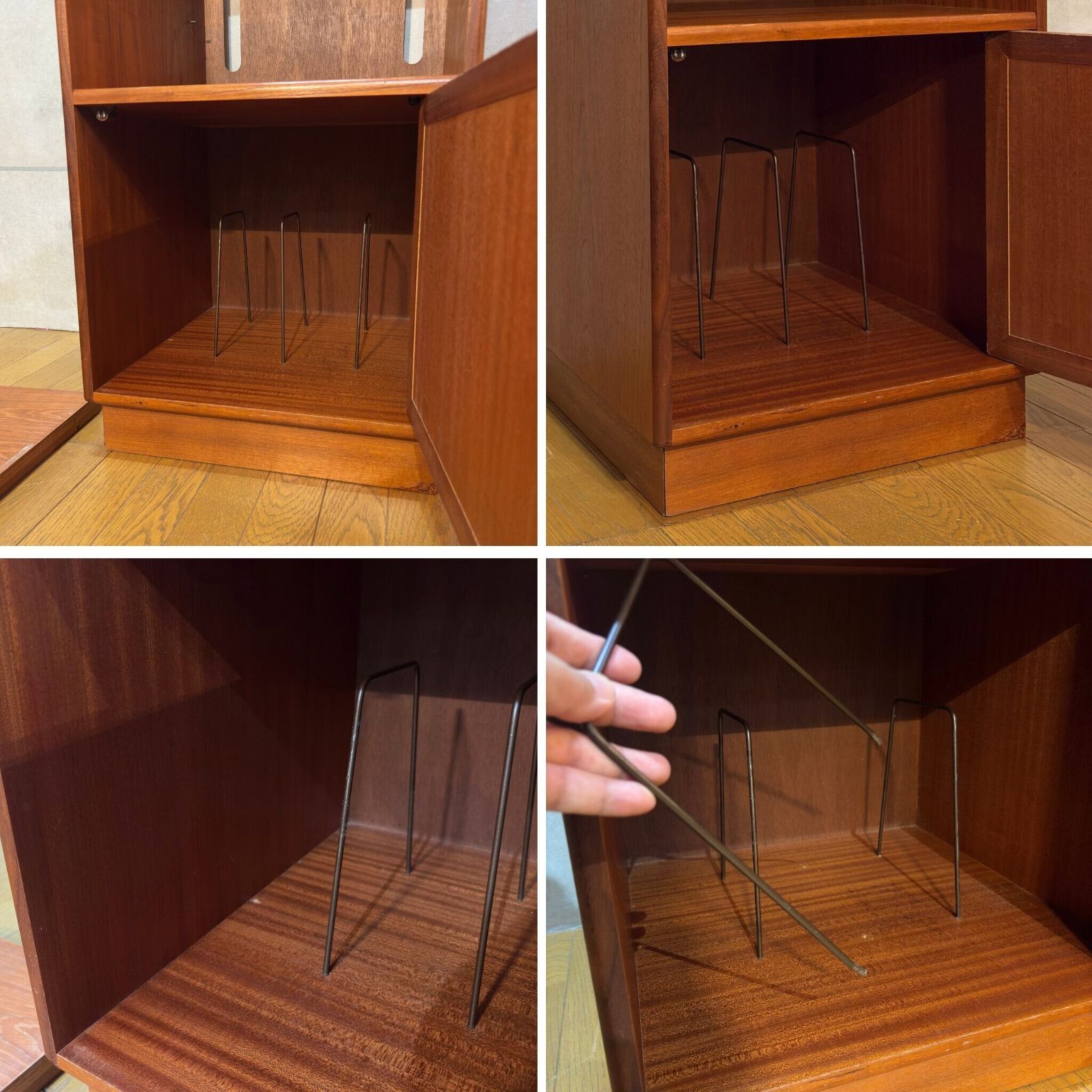 下部の扉内はLPレコード(12インチ盤、ジャケット高 約31.5cm)を立てて収納するために設計されています。扉内寸は高さ37cmと余裕をもって収納し、取り出しやすい最適な寸法です。内部にはアイアン製ラック(仕切り)が残っています。取り外しも可能です。