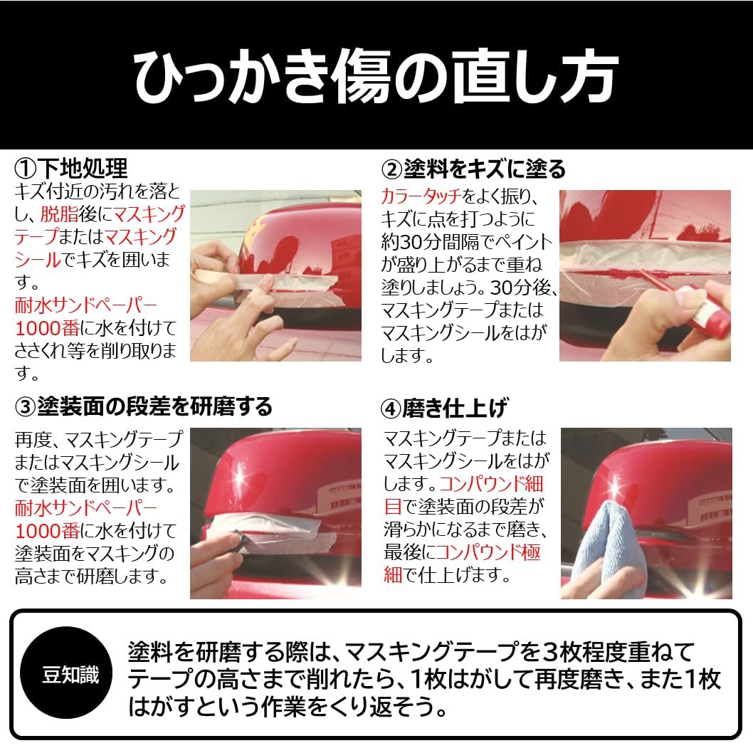 愛車の小さな傷や剥がれを補修する筆塗りタイプの塗料です。キズを目立たなくさせ、またサビも防ぎます。深い傷には重ね塗りをして下さい。乾燥後、コンパウンドで磨くと美しく仕上がります。