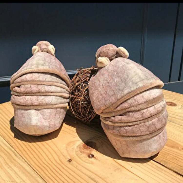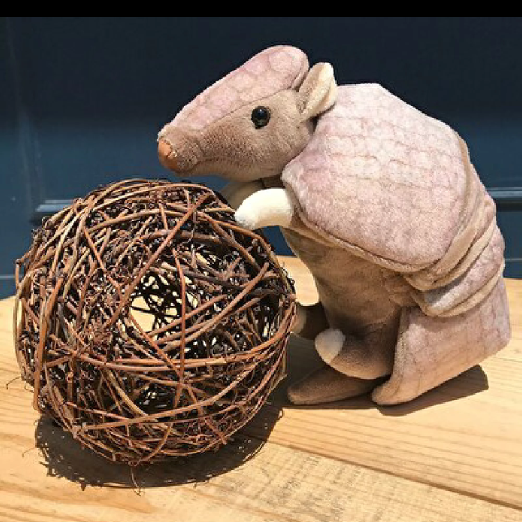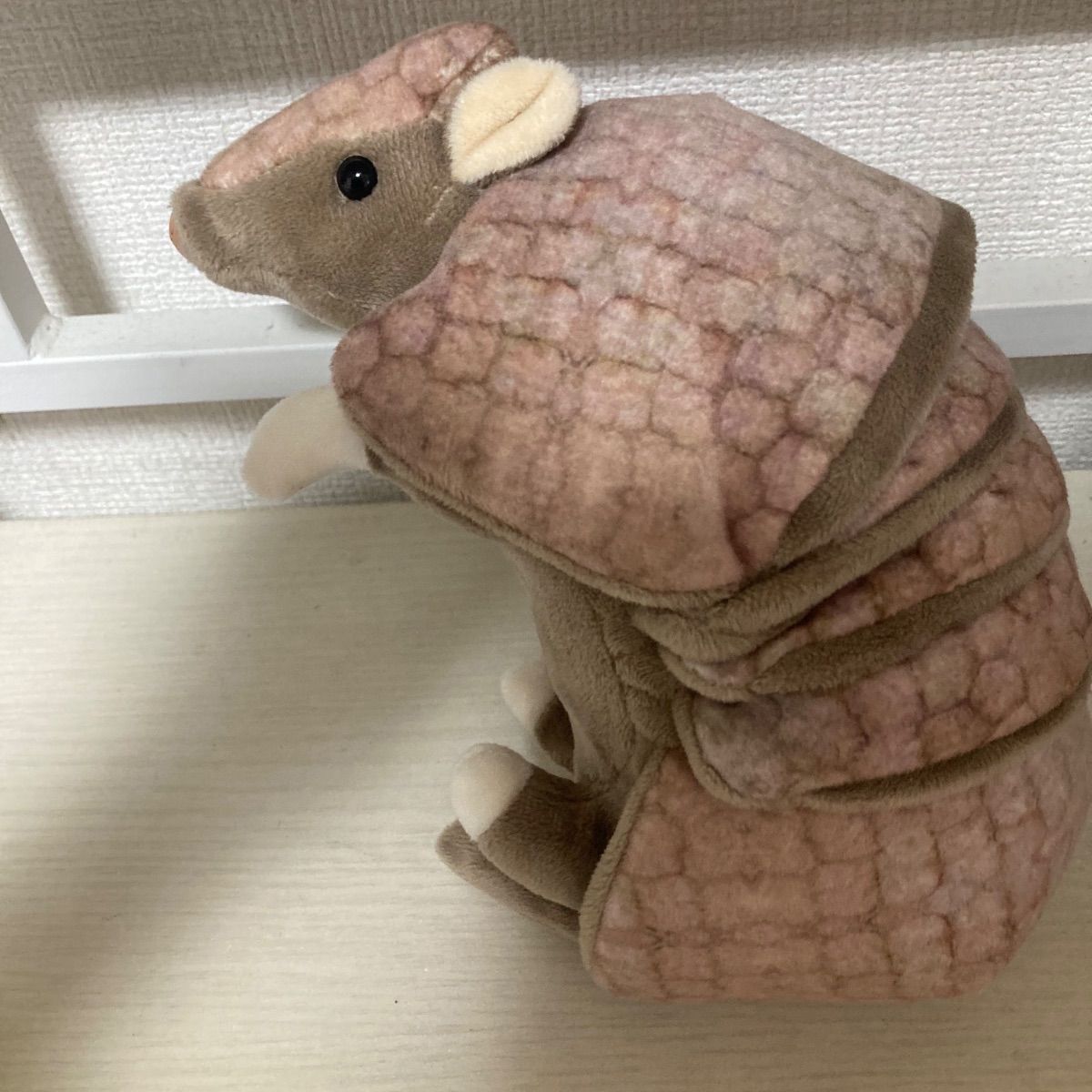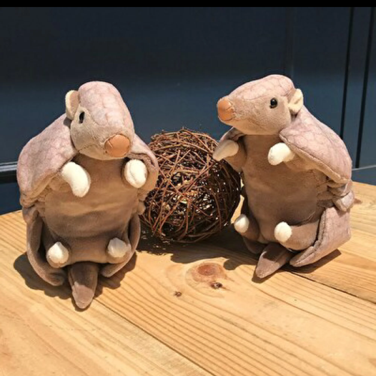 アルマジロがぬいぐるみになって登場。特徴的なまんまるとした姿がなんとも可愛らしい甲羅の模様やフォルムなど、しっかりと特徴を捉えました。