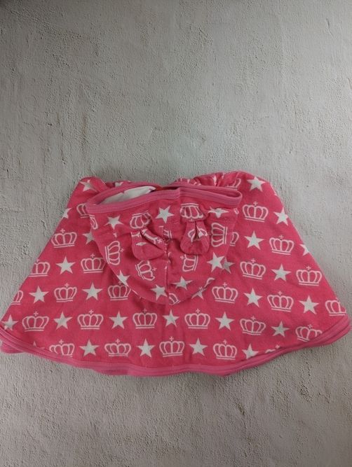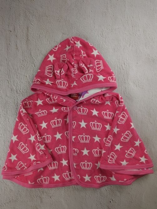 ピンクでかわいいBABYDOLLのポンチョです。表は毛足の短いタオルっぽい素材で、裏地はガーゼっぽい生地です。70~90くらいのサイズ感だと思います。