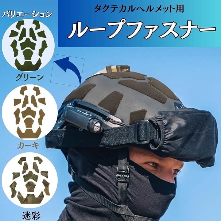 (2) 滑り止め効果で装備追加が可能に:ループファスナーを貼ることで、ヘルメット表面が滑らなくなり、面ファスナー対応のパッチやライト類が確実に固定されます。