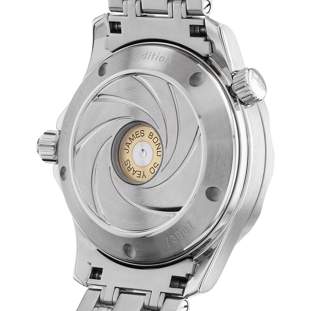 ■モデル情報:文字盤に007のロゴをあしらった、007ジェームズボンド世界限定3007本モデルです。銃口を模した特徴的な裏蓋からJAMES BOND 50 YEARの文字があるローターが確認できます。10時位置にはヘリウムエスケープバルブを搭載。コーアクシャル機能付のクロノメータームーブメントなどハイスペックのプロフェッショナル仕様です。300m防水。