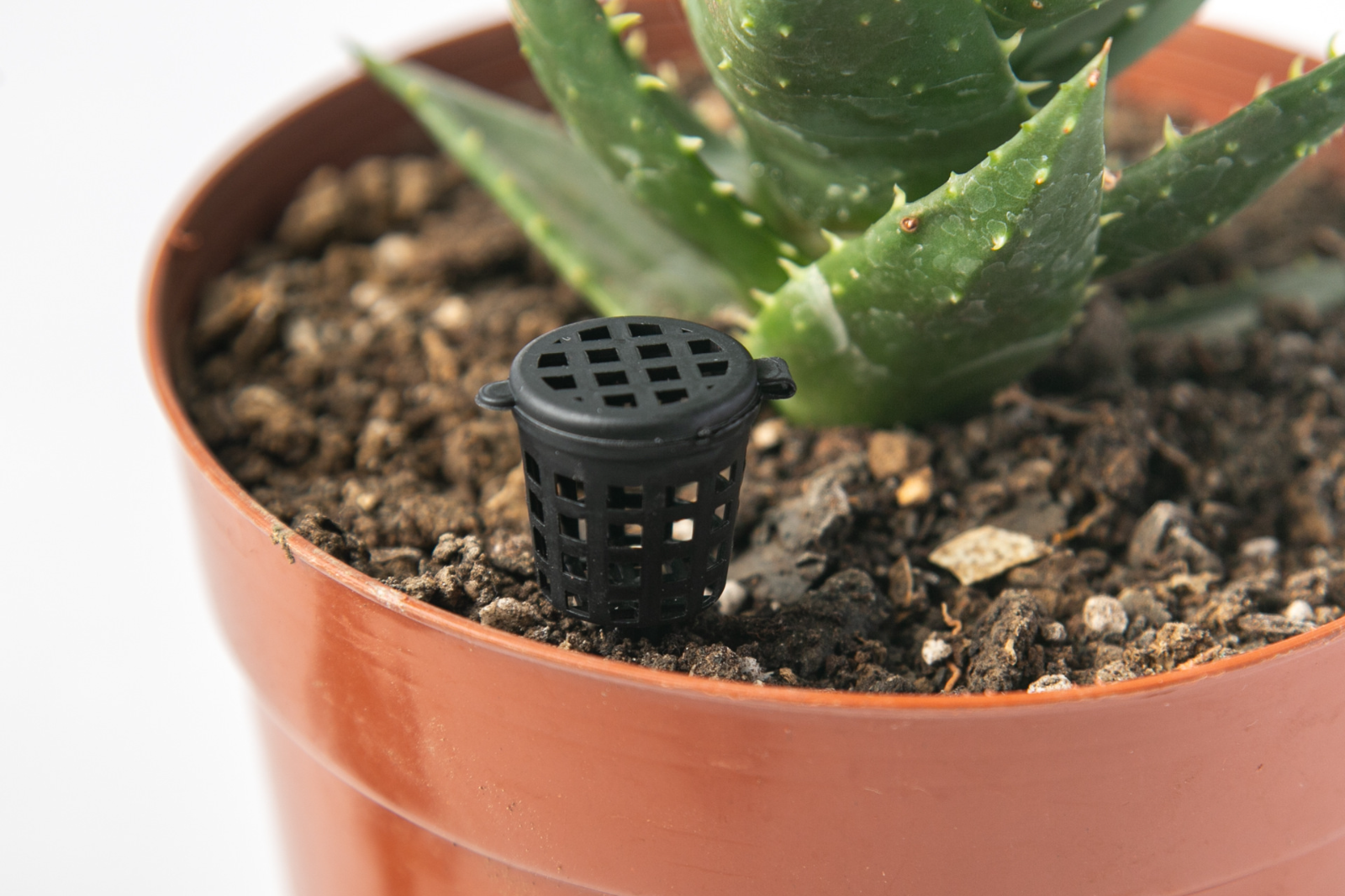 ケースの中に固形肥料を入れて、鉢やプランターの土に差し込むだけ!