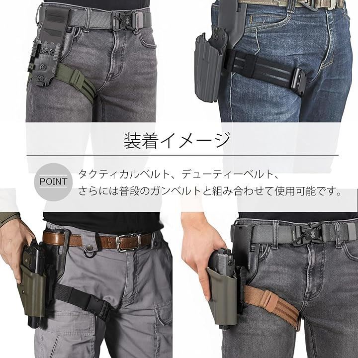 レッグホルスターだけでなく、太ももポーチやドロップレッグパネルなど、脚部に装着するあらゆるギアの揺れ防止、固定補助として活躍します。