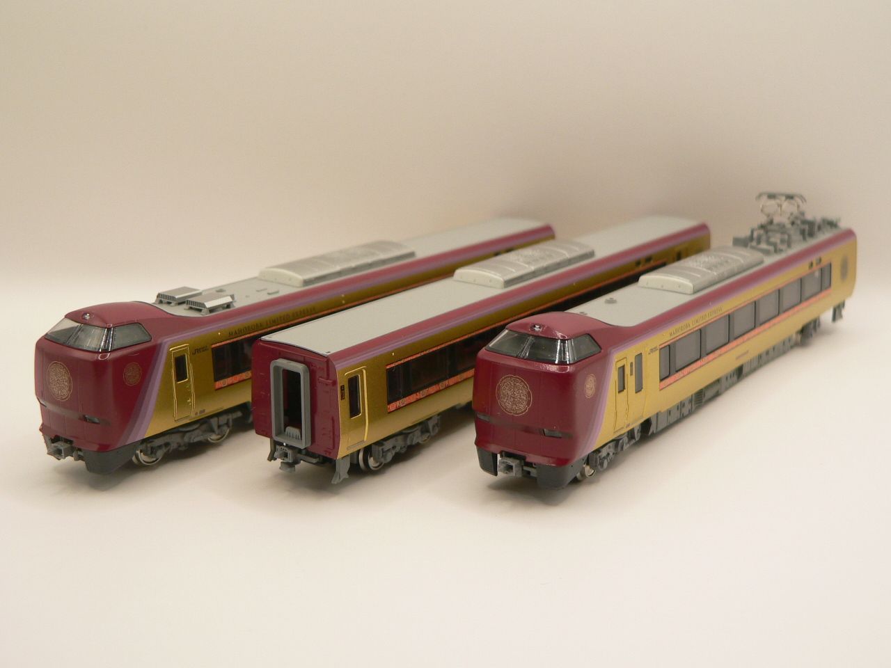 ●特急「まほろば」は大阪と奈良を結ぶ特急列車で、かつては臨時列車として使用車両や運行ルート、停車駅を変えながら運行されていました。令和7年(2025)3月からは定期列車化され、4月からは683系2000番台の3両編成をリニューアルして6000番台に改めた専用車両が投入されました。4月に投入された第1編成「安寧」の車体塗色には「あふれる生命感や豊穣をあらわした金色」と、「奈良時代に大陸から伝わった染料に由来し、当時の宝物にも多く見られる蘇芳(すおう)色」が使用され、万物の安寧をあまねく照らす「楽園の陽光感」を表現したデザインが特徴となっています。①吹田総合車両所京都支所所属のN01編成を製品化