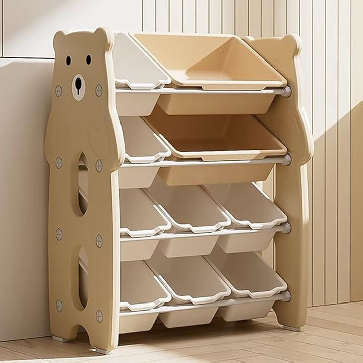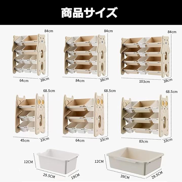 「商品仕様」「商品名」:子供おもちゃ収納ラック;「色」:カーキ;「サイズ」:三段は幅45/64/83cmx奥行き33cmx高さ68.5cm、四段は幅64/84/103cmx奥行き38cmx高さ84cm(*三段はフクロウで、四段はクマのデザインです);「材質」:HDPE