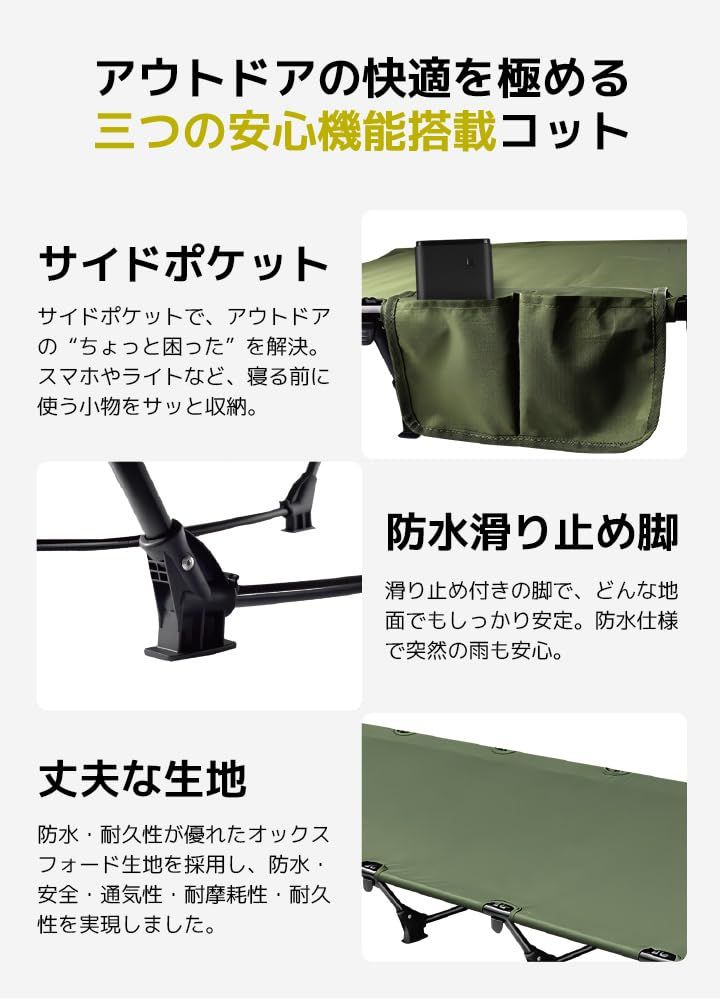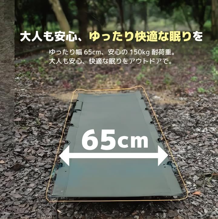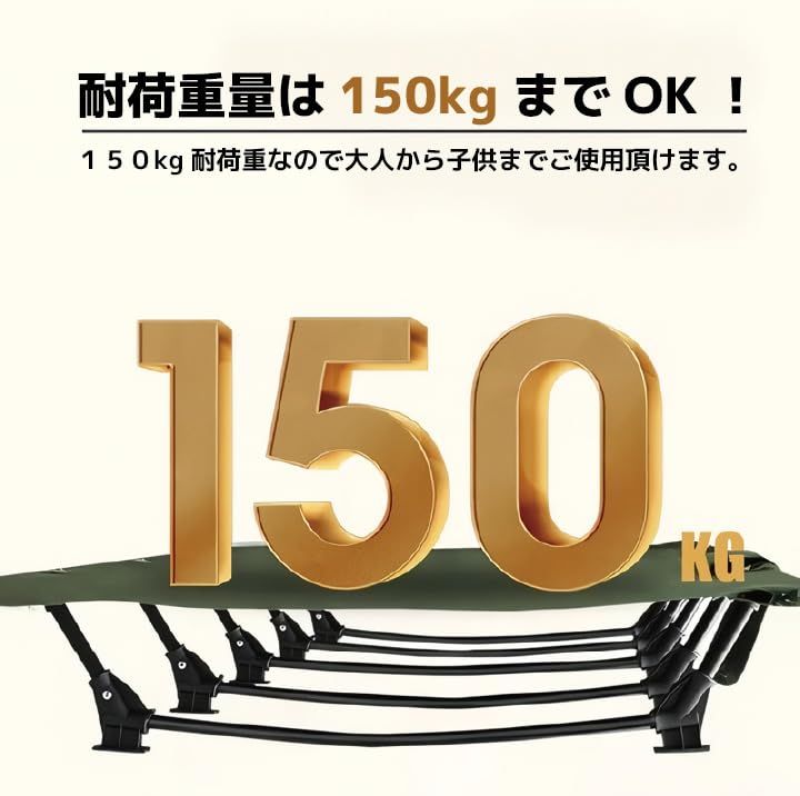 一般のコットと比べて、足が5付いて安定感は抜群で、しっかり支えています。150㎏の高い耐荷重を実現できます。