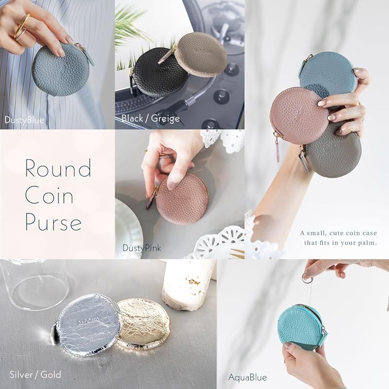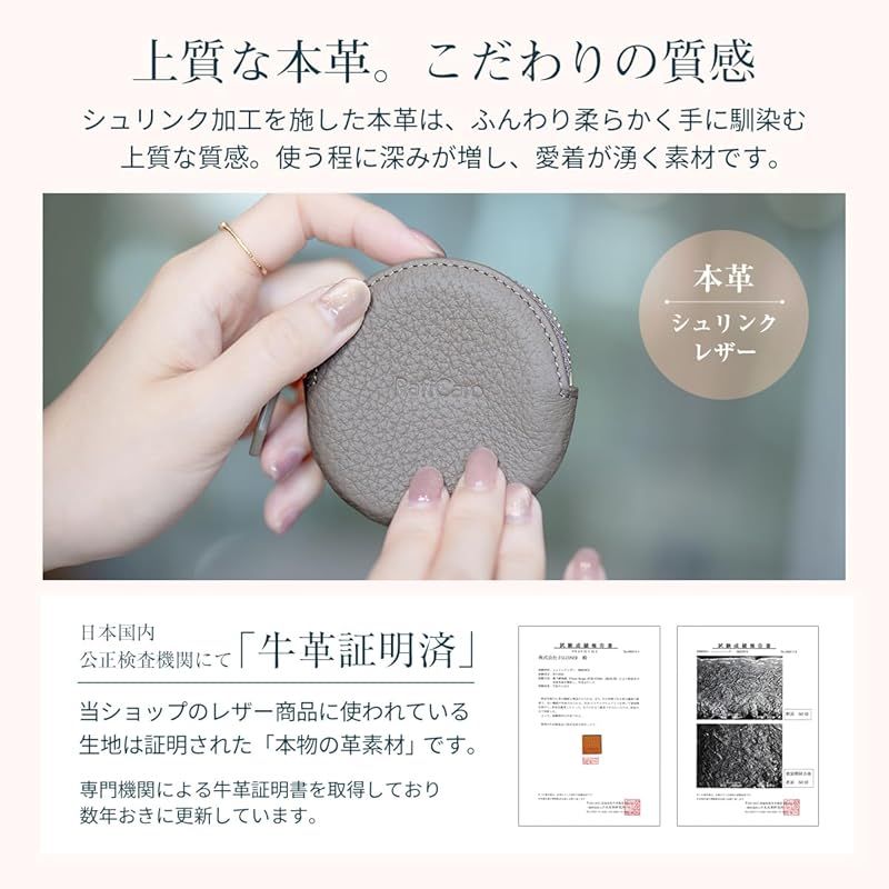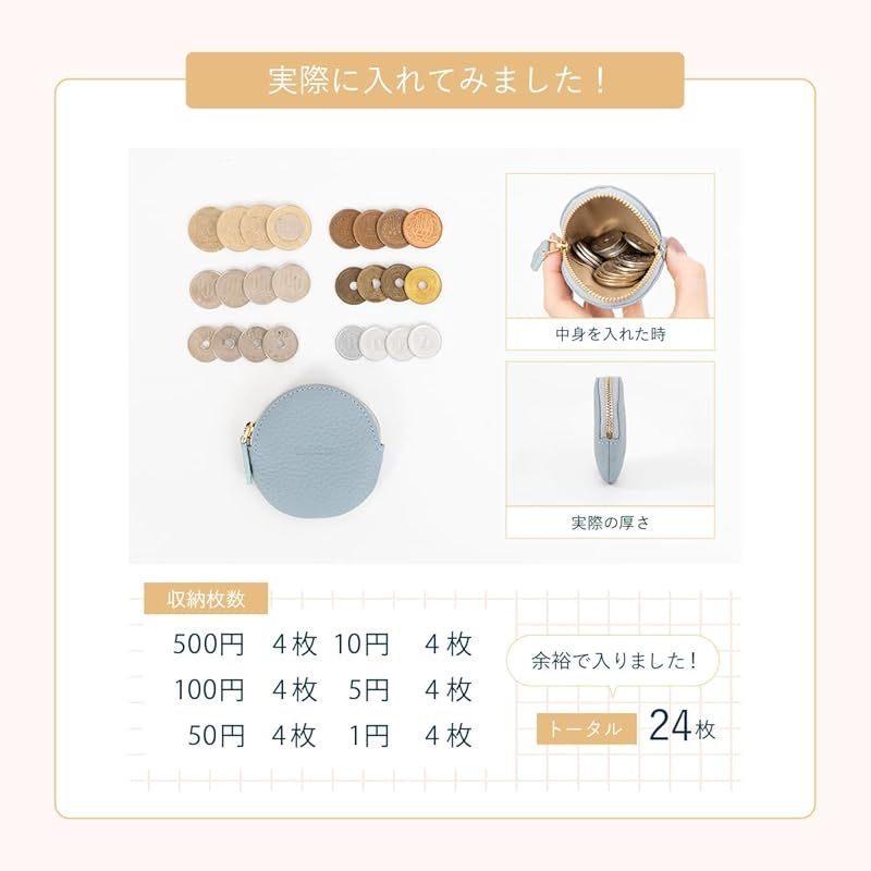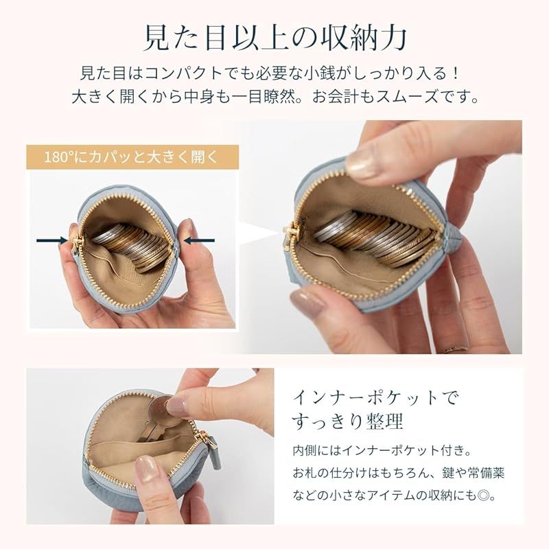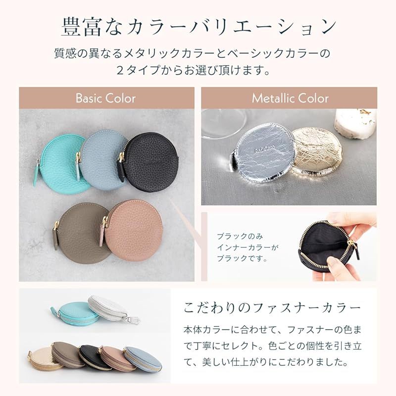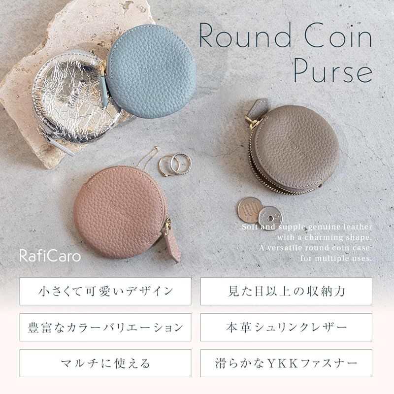 【ブランド】 RafiCaro - ラフィカロ - 【品番】 a74119 【スペック】 ・メインポケット × 1 ・インナーポケット × 1 【サイズ】 ・縦 78mm × 横 80mm × 厚み 20mm ・重さ 20g 【素材】 ・表地:本革 ・裏地:ナイロン 【手のひらサイズのレザーケース】 まるいフォルムがかわいい小銭入れです。小さめバッグにもポケットにも収まり、気軽に持ち歩けるサイズ感。見た目以上の収納力。コイン以外にもアクセサリーやイヤフォンのケースとしてもお勧めです。 【手触りの良い本革仕様】 優しく手に馴染む、柔らかなシュリンクレザーを使用しています。ファスナーはYKK製、内側には仕分けに便利なインナーポケットをお付けしました。豊富なカラーバリエーションで、色違いのプチギフトにも◎ 人気の7カラーをラインナップ。かわいい、おしゃれ、クール、カジュアル、ビジネス、フォーマルなどスタイルに合わせてお選び頂けます。 記念日 などの プレゼント 母の日 父の日 バレンタインデー ホワイトデー 誕生日 クリスマス 等の ギフト にも おすすめ です。greige グレージュ / dustyblue ダスティブルー / dustypink ダスティピンク / gold ゴールド / silver シルバー / aquablue アクアブルー / black ブラック