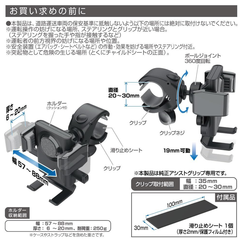 ・アシストグリップ取付けで視界を妨げにくいスマホホルダーです。 ・ネジ式クリップのため、アシストグリップにしっかりと取付けできます。 ・目の高さに設置したスマホは視線移動が少なく、画面を確認しやすいのでカ-ナビに最適です。 ・間接アームが無い構造で振動に強いため、揺れにくく、操作がしやすいです。 ・アシストグリップを備えた軽バンやワゴン、トラックなどの商用車に最適です。 ・ホルダー部は、スマホで押し当てるだけのワンタッチホールド機構を搭載しています。 ・背面のボールジョイントにより、ホルダーの向きが調整できます。 ・アシストグリップのキズ防止に有効な滑り止めシートが付属しています。