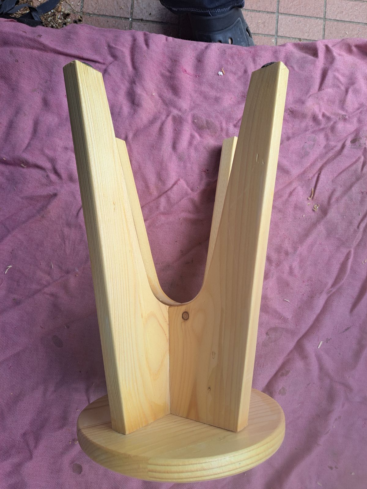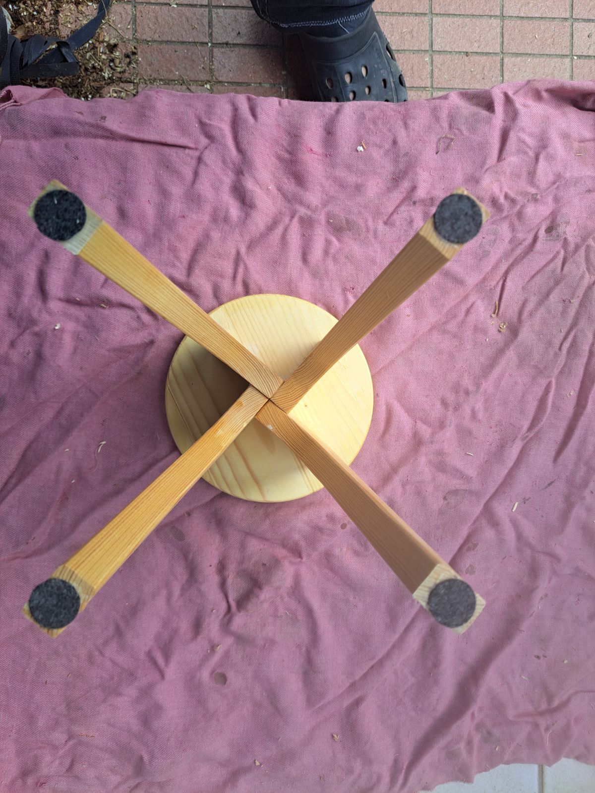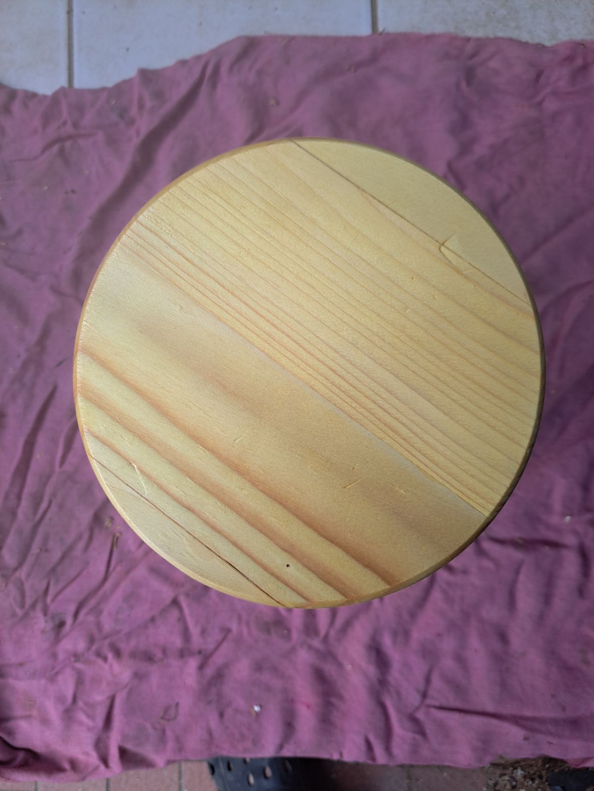 320mmにしてみました。 木材はホームセンターのホワイトウッドで直径195mmです。 仕上げは木材の質感を失わない程度に薄くウレタン仕上げです。 ※発送前にはガラス面上でガタツキ調整して発送しますが設置環境が変われば多少ガタツキが出るかもしれませんが、その場合にはフェルト等貼り付けで調整してください。 キッチン用椅子や 屋内等インテリアに如何でしょうか? 素人の手作り品で自然素材なので節や割れやキズの埋め木パテ埋めや塗装むらはありますが、それも手作り感とご理解下さい。依って家具屋さんで見るような高級家具と比較されては困ります。