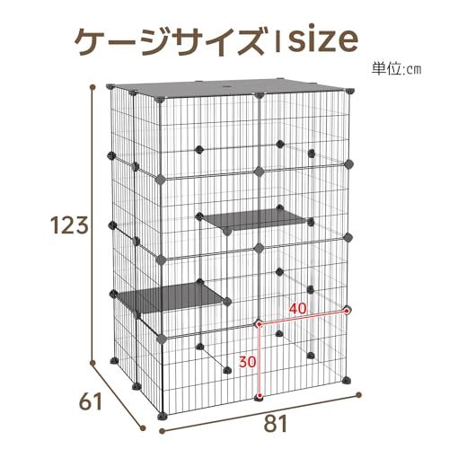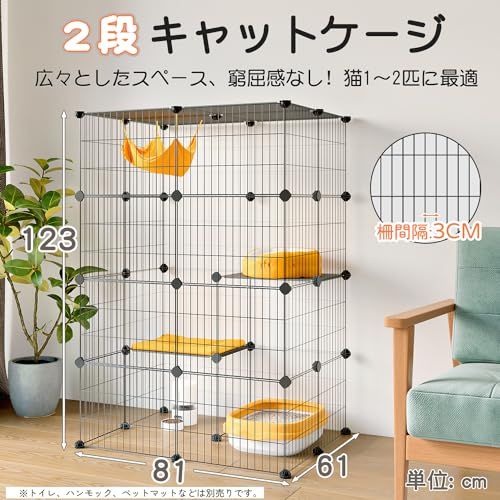 【広々としたスペース】サイズは高さ123幅81奥行き61cm、猫ちゃんがのんびりリラックスできます。高さがあり、棚板が2枚付き、ケージの中でいっぱい運動出来ます。トイレを置いても猫が歩けるくらいの広さがあり、快適で窮屈感ないです。