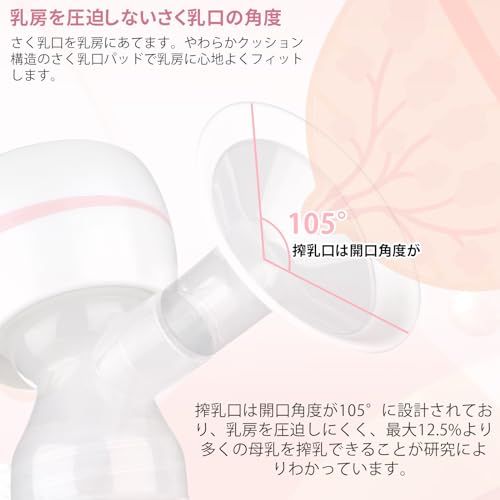 【新形状の搾乳口】開口角度が105に設計されており、乳房を圧迫しにくく、最大11.8%より多くの母乳を搾乳できることが研究によりわかっています。また、柔らかいシリコンパッドのデザインで、胸に快適にフィットし、柔らかく暖かい感触を提供します。
