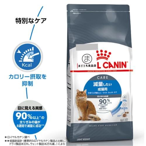 【目に見える実感】 90%*以上の太りぎみの猫が8週間で減量に成功** ライト ウェイト ケアのドライを8週間*使い続けることで、減量に成功**しました。 *ロイヤルカナン調べ **ロイヤルカナン ライト ウェイト ケアのドライとウェットの低脂肪設計により。 (標準的なロイヤルカナン製品に含まれる脂肪量と比較し、ドライ製品は33%、ウェット製品は25%減。)