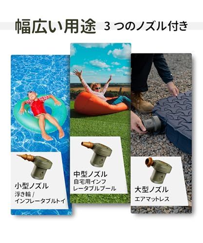 【ノズルセット付き】3つの取り外し可能なノズルを付属、ほとんどのインフレータブル製品に対応できます。エアベッド、エアソファ、インフレータブルトイ、インフレータブルプール、浮き輪などに適しています。 耐久性のあるプラスチック製で、-10から40までの温度範囲で使用可能