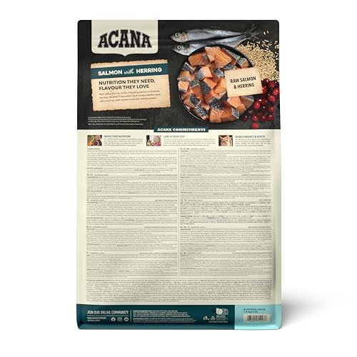 生の丸ごとサーモン(15%)、ディハイドレートサーモン(15%)、ディハイドレートニシン(15%)、ホールオーツ、丸ごとエンドウ豆、ポロック油(8%)、丸ごと緑レンズ豆、生の丸ごとヘイク(4%)、生の丸ごとニシン(4%)、丸ごとヒヨコ豆、丸ごと赤レンズ豆、レンズ豆繊維、生のニジマス(2%)、サーモン油(2%)、ヒマワリ油、乾燥ケルプ、新鮮丸ごとバターナッツスクワッシュ、新鮮丸ごとカボチャ、新鮮丸ごとクランベリー、新鮮丸ごとブルーベリー 酸化防止剤:天然成分から抽出したトコフェロール 添加栄養素(1kg中):塩化コリン1200mg,タウリン400mg,亜鉛(アミノ酸水和物の亜鉛キレート)150mg,ビタミンB1 12.5mg,ビタミンB2 10mg,ナイアシン50mg,ビタミンB5 8mg,ビタミンB6 6.5mg,葉酸0.75mg,ビオチン0.125mg,ビタミンB12 0.1mg,,ビタミンA 3750IU,ビタミンD 500IU,ビタミンE 170IU,ビタミンK 0.5mg,銅(アミノ酸水和物の銅キレート)11mg,L-カルニチン50mg,DL-メチオニン99mg 添加腸球菌:エンテロコッカス・フェシウム菌