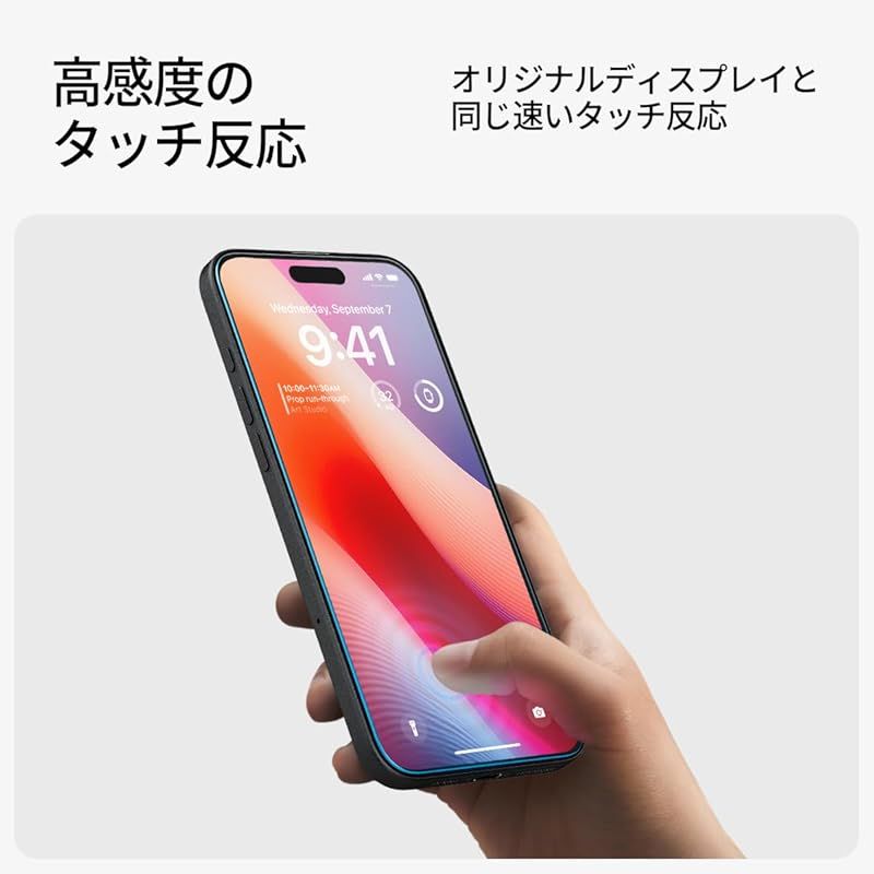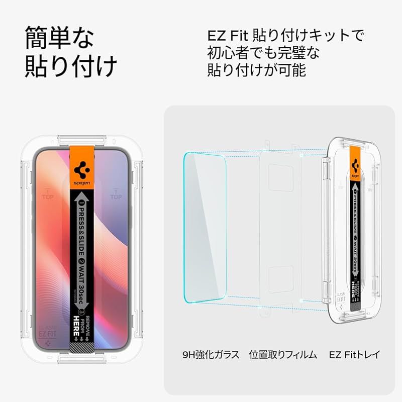 商品名:Spigen iPhone 16 ガラスフィルム iPhone 15 対応 9H硬度強化ガラス 貼り付けキット付き iPhone16、iPhone15 保護フィルム ナノコーティング 飛散防止 2枚入 EZ Fit AGL06903