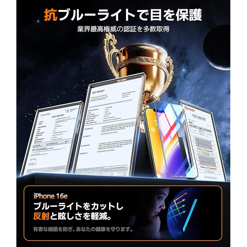 【超クリアなロスレス画質&健康を全面的に守る】このいphone 16 e 保護フィルムは、新しくアップグレードされた高透過率素材を採用し、高透光率、スマホ画面のオリジナルの高精細な画質を再現、超クリアな視覚体験を提供します。また、弊社のいphone 16eガラスフィルムは、国際認証のブルーライト防止テストと抗菌テストをクリアしています。ガラスフィルム表面のAnti-Reflective/Anti-Blue Lightコーティングにより、ブルーライトをカットし、長時間や夜間にスマホを使用する際、ブルーライトが視網膜に与える潜在的なダメージを防ぎます。 目を大切に!さらに、最新のナノ抗菌技術を採用し、表面に付着する99.9%の細菌を強力に抑制します。お子様も安心して触れることができ、あなたとご家族の健康を全面的に守ります!