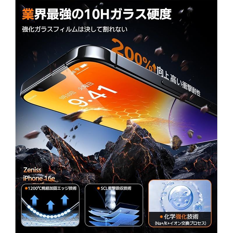 【硬度レベル!10H 強化ガラス フィルムで究極の保護を】弊社のiphone用の 16e フィルムは、米軍規格の航空宇宙グレードの高アルミシリコンガラス素材を使用し、最新のNa+/K+イオン交換技術により、ガラス内部に圧縮緩衝層を形成しています。1200℃で10時間の高温硬化を繰り返し強化、10H硬度レベルを実現。硬度と耐衝撃性が市販の普通製品より20倍も高いです。200%の保護力で衝撃や傷からiPhoneを最大限に守ります。鍵やコインなどの鋭利な物と一緒にバッグに入れても傷がつきません。さらに、ガラスは破片飛散防止加工が施されており、使用者の安全を確保する。 安心してお使いいただけます。絶対的な安心感を与えます。
