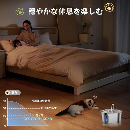 【猫の健康は水から清潔な飲み水を維持する給水器】GERYTORが最新の市場調査をもとに開発したプレミアムステンレス猫 みずのみ器は、従来品の3大課題「フィルター材質の劣化による水の粘つき」「タンクの粗悪な材質」「騒音の大きいポンプ」を徹底的に改善。当社が独自開発した6層複合フィルター(銀イオン技術採用)は精密ろ過機能を備え、水の粘つきを防ぎ、常に清潔でサラサラな水質を維持。さらに食品グレードSUS304ステンレス製タンクには特殊加工を施し、汚れの付着を抑制して猫の顎周りを衛生的に保つ設計を実現。加えて深夜でも気にならない静音設計の長寿命ポンプを採用し、愛猫の快適な飲水環境をトータルでサポートしています。