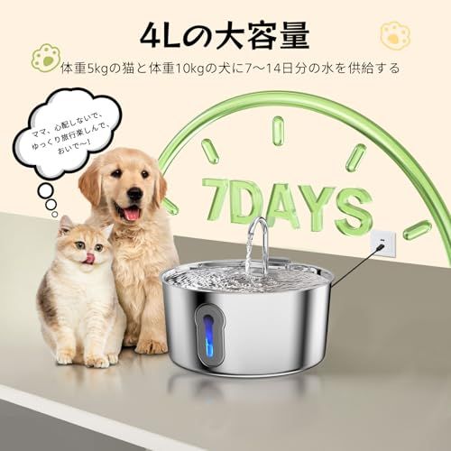 【4L大容量プロ仕様衛生管理】猫・犬対応給水器は、猫5kg犬10kgまで最長2週間の給水を可能にする4Lタンクを搭載。完全分解可能なプロユース設計で、70食洗機洗浄にも対応。銀イオンフィルター(23週間交換)と専用スポンジフィルター(1ヶ月ごと交換)のデュアル交換システムを採用。週1回のポンプ簡易洗浄と月1回のポンプ本格洗浄を推奨いたします。特にポンプ内部の洗浄を定期的に行うことで、多頭飼い環境でも常に清潔な飲み水を維持できます。