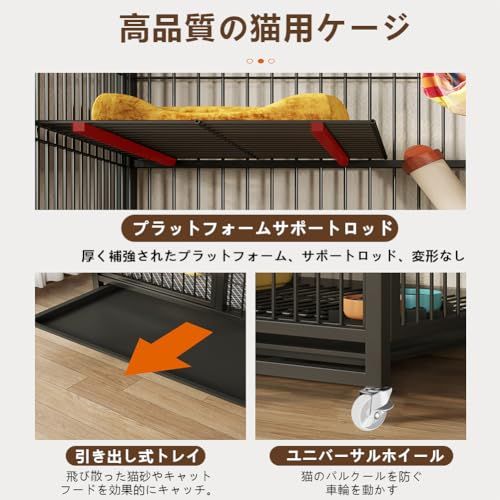 【出入り便利】異なる体型の猫にも同時に使用できます。猫が休息や遊びをする場所になります。ケージのスペースを分割し、複数の猫や他のペットが使用できます。スペースを有効に活用し、猫の幸福感を効果的に高めます。ドアの開閉位置に応じて猫が自由に出入りできます。キャットケージにはドアと天窓が付いており、砂の掃除がしやすい特大のサイドドアと、猫とのふれあいがしやすく、キャットハンモックを簡単に吊るせる天窓が上部に付いています。このミニキャットケージは、ちょうど良い大きさで、あらゆる種類の猫に最適です。