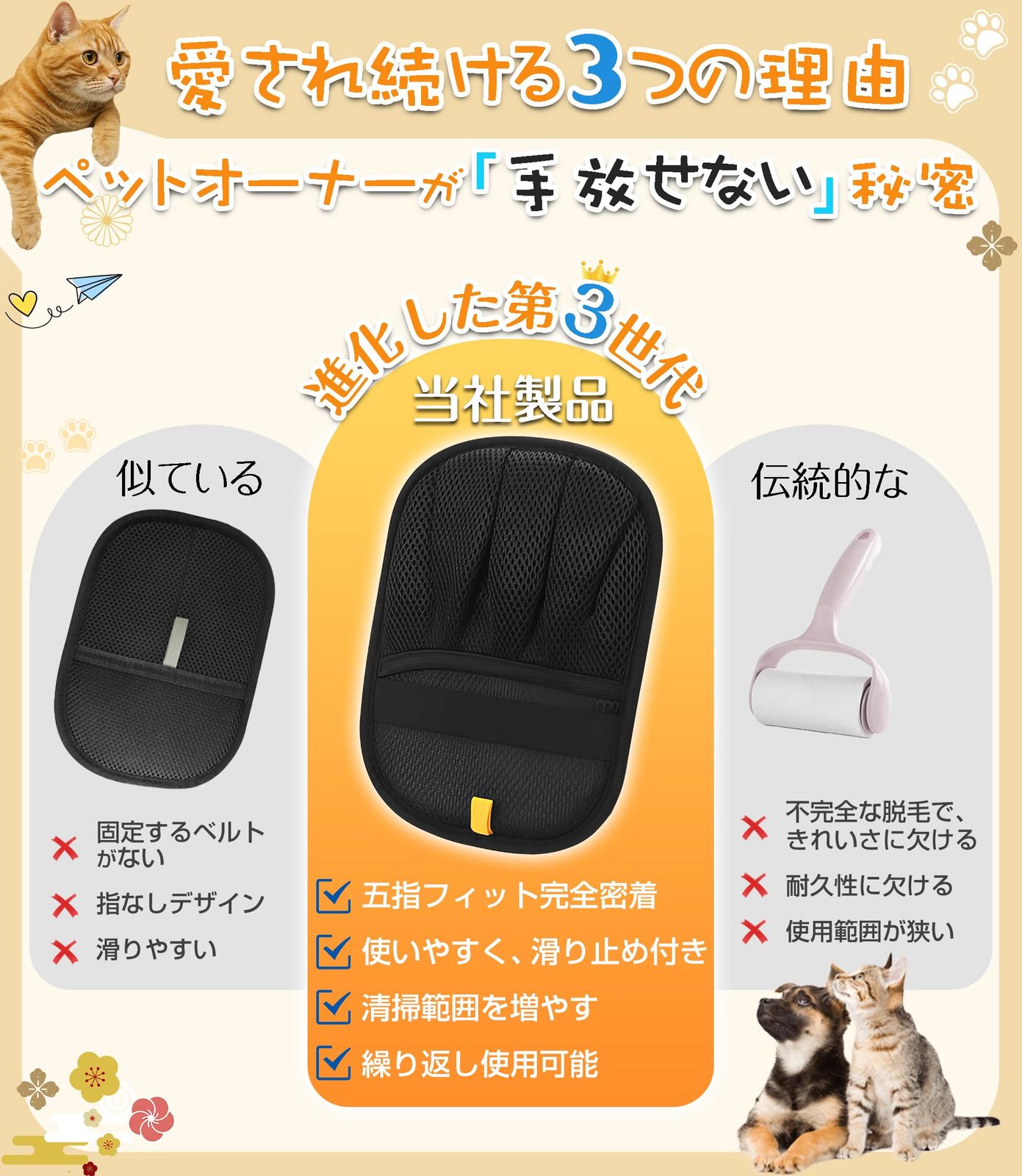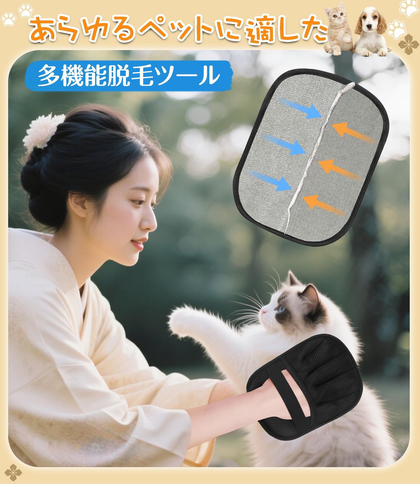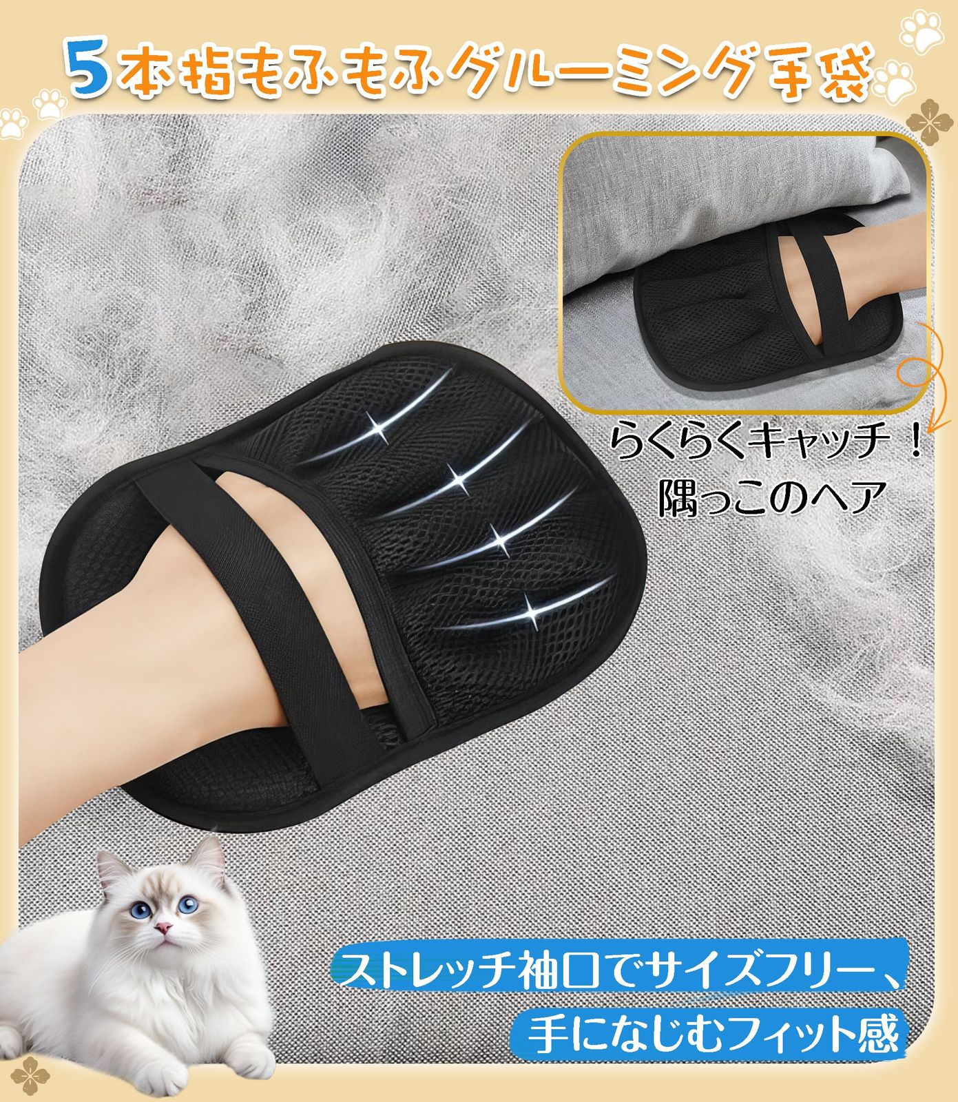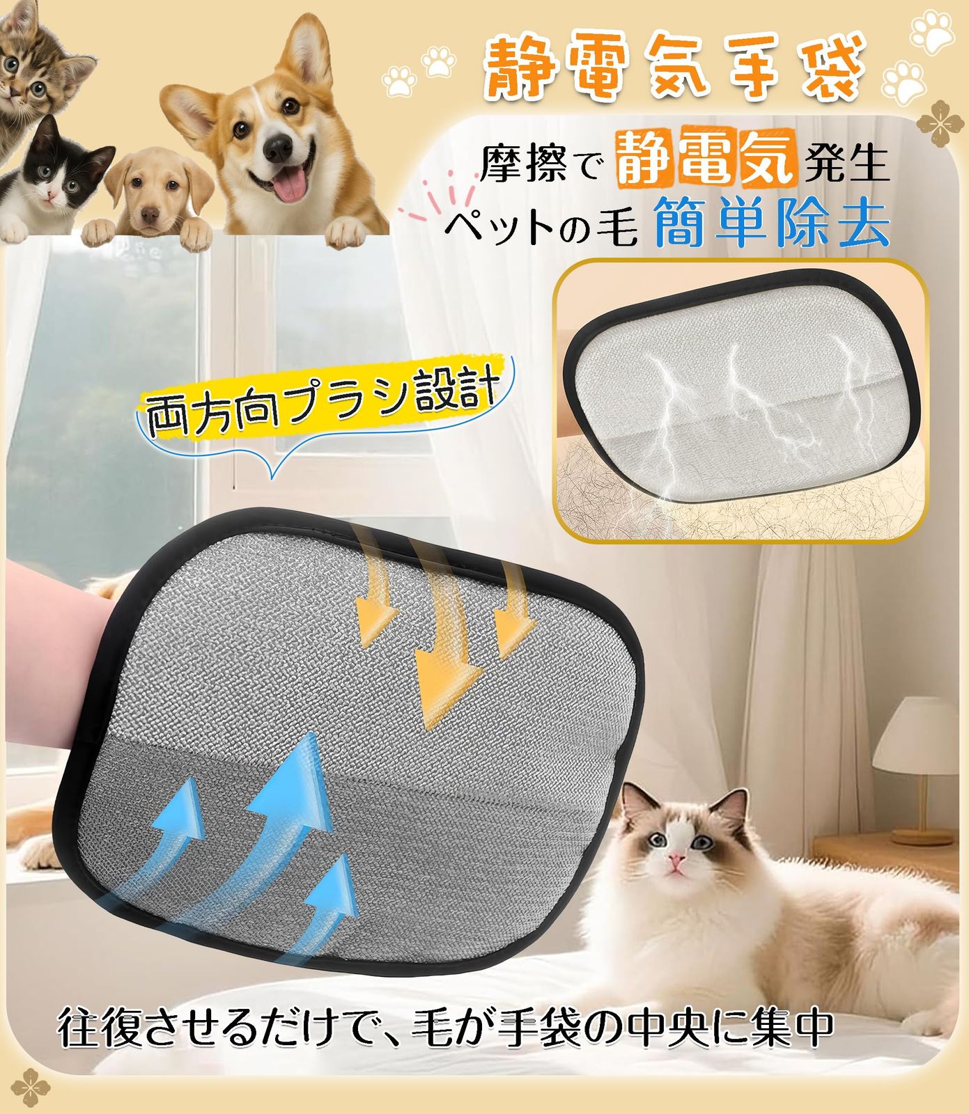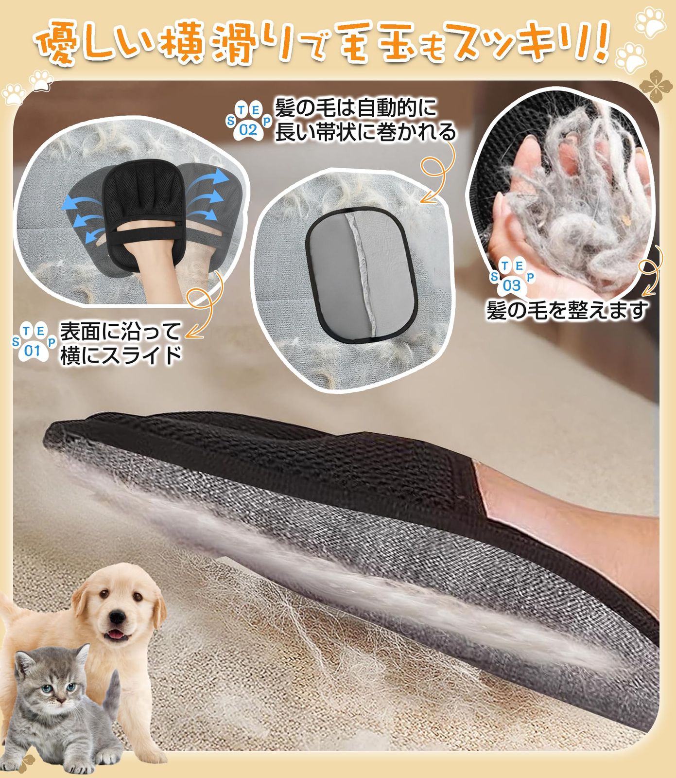 【抜け毛簡単】ペット用静電毛取りグローブは、手にはめてなでるだけで、ワンちゃんやネコちゃんの抜け毛をしっかりキャッチ。静電気の力で細かな毛やフケまでしっかり吸着!