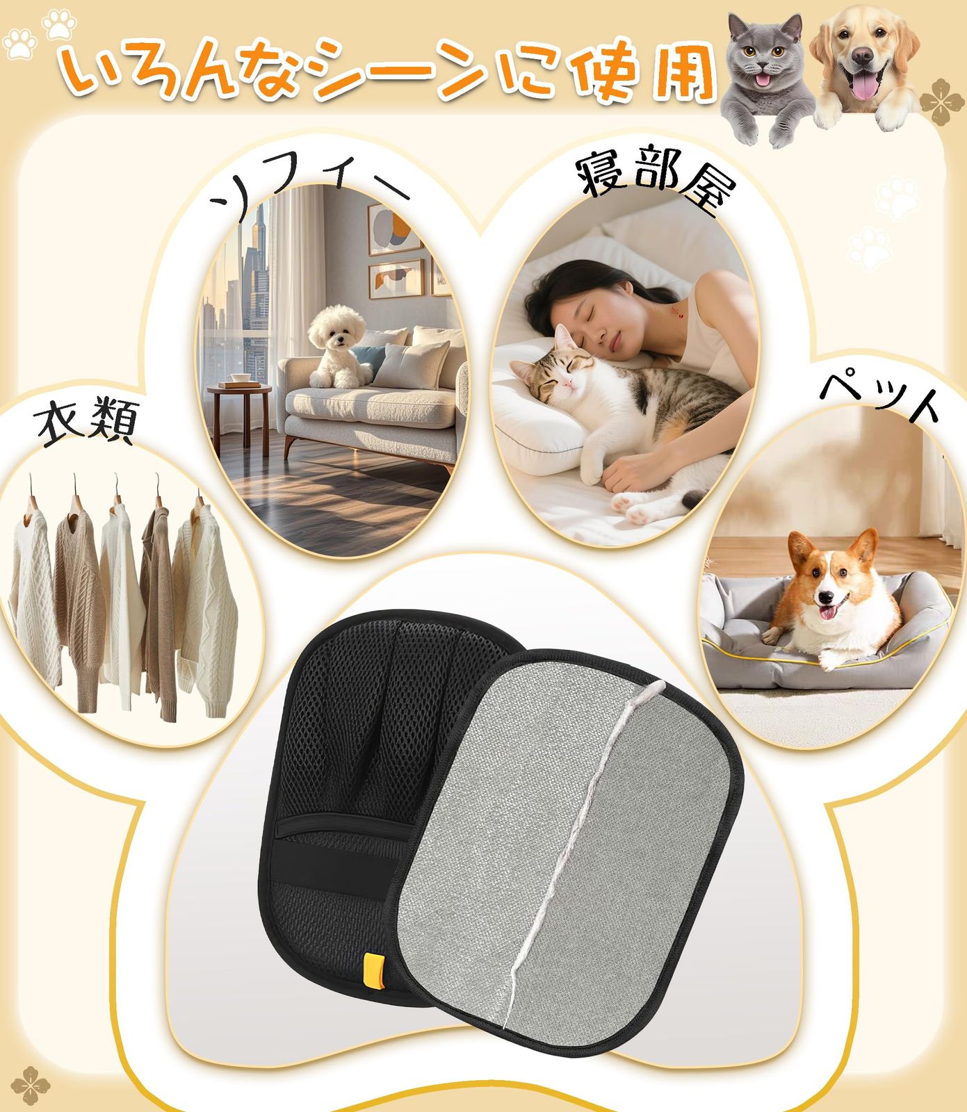 【様々な表面で効率的に毛を除去】ソファ、カーペット、衣類、車のシートなどからペットの毛を取り除くのに、再利用可能なペット用除毛グローブがおすすめです。両面コーミングデザインで広い範囲を素早くカバーし、ご家庭や車のあらゆる場所で、猫や犬の毛の掃除を素早く簡単に行えます。
