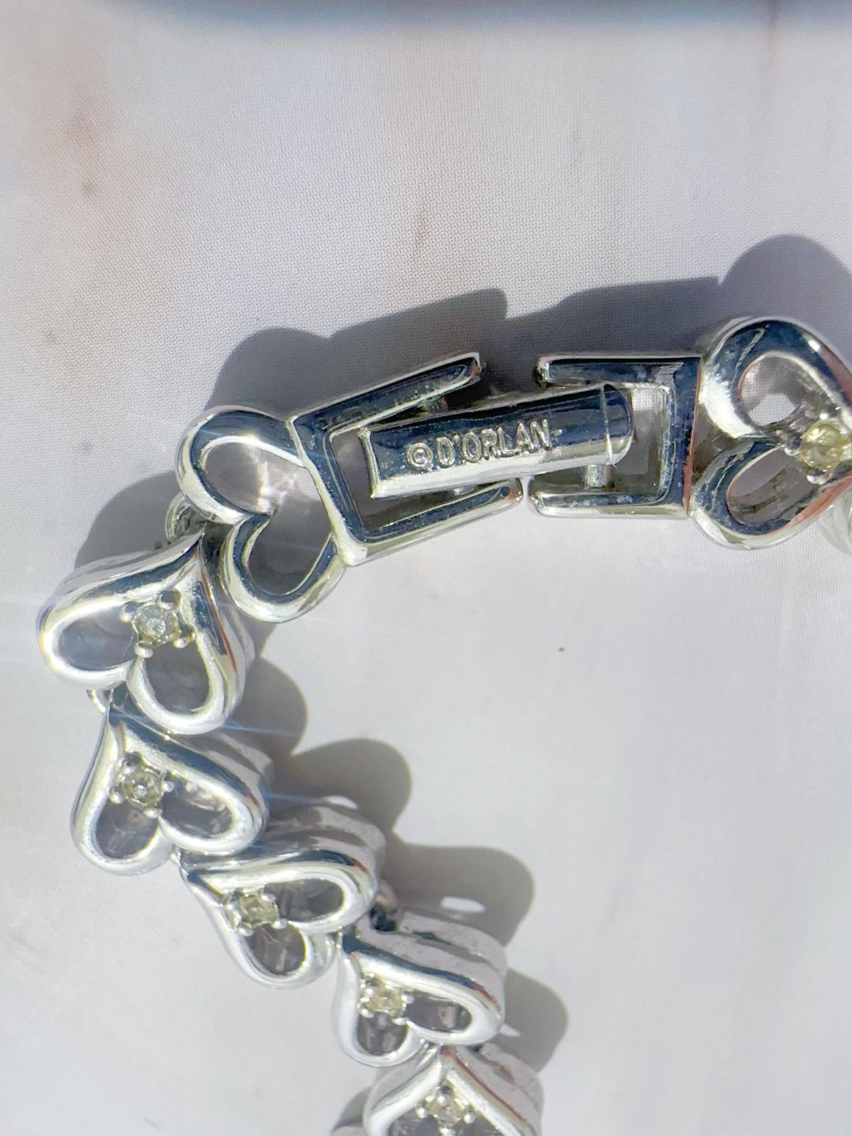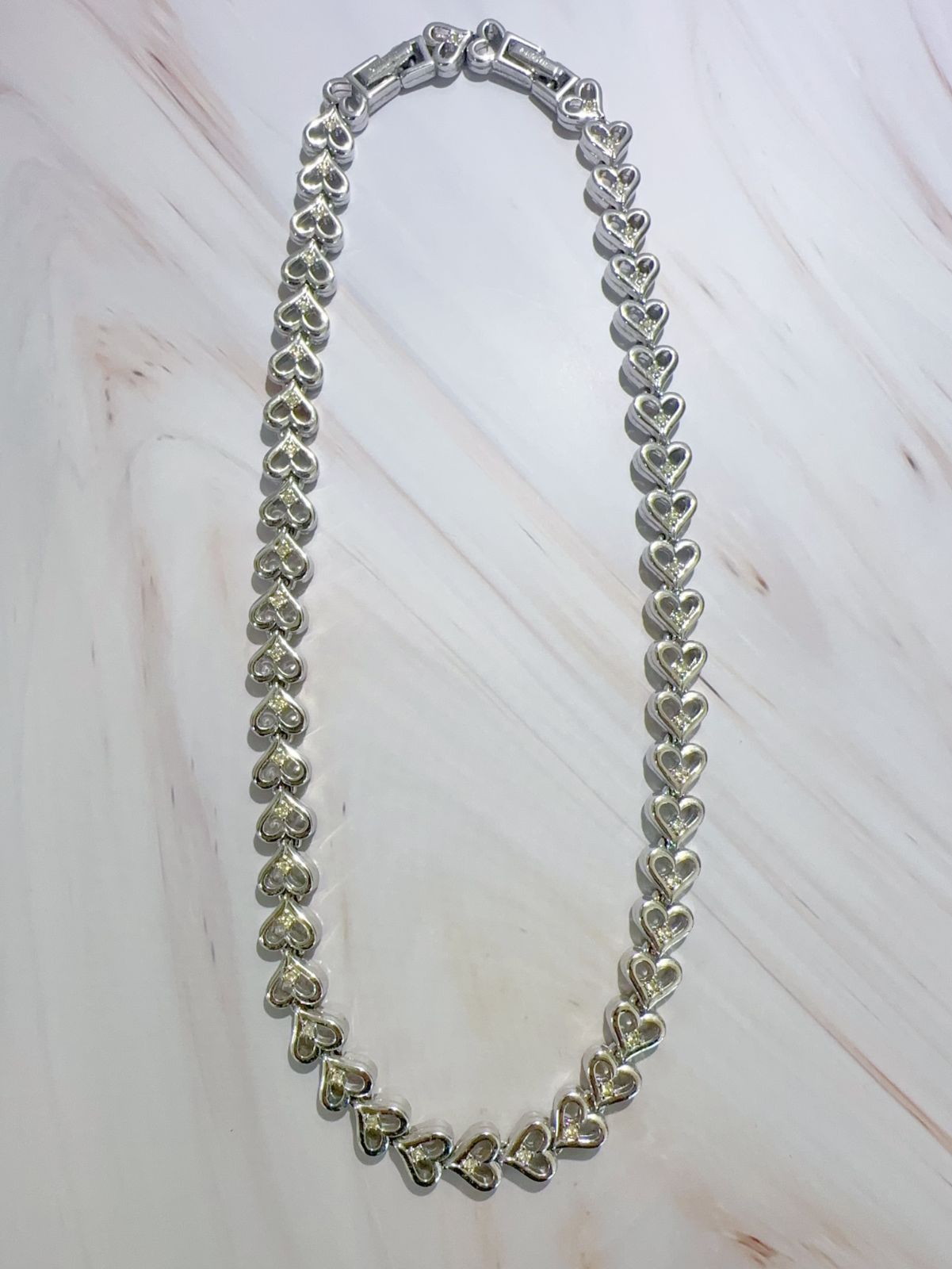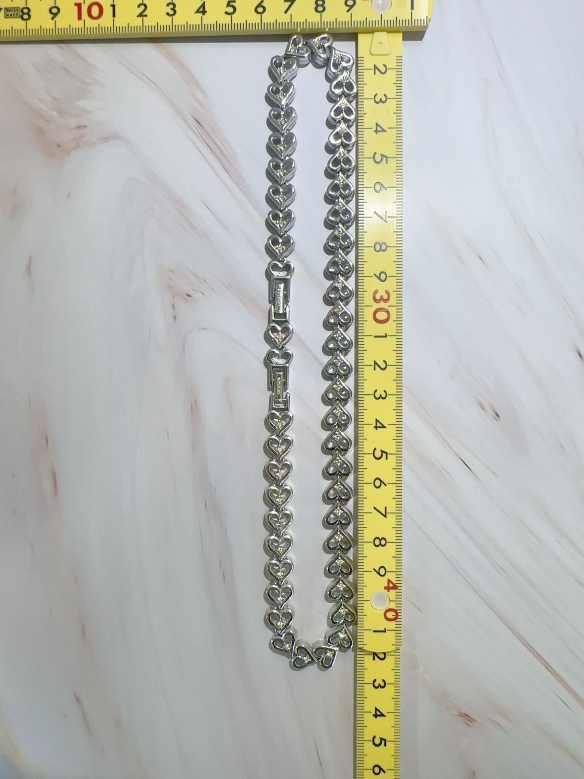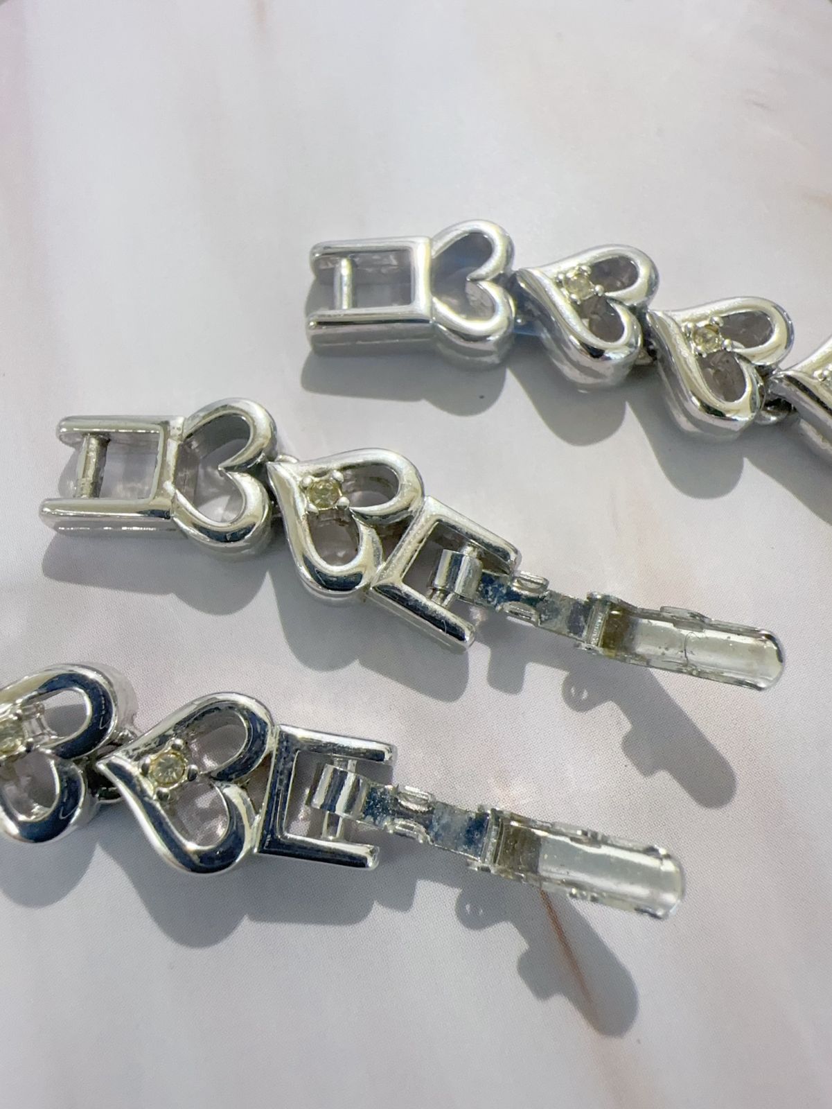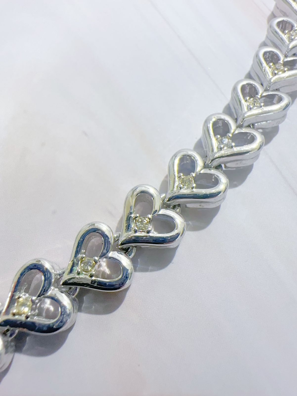 シルバーカラーのハートモチーフが連なり、中央には小さなラインストーンが輝く上品なデザインです。