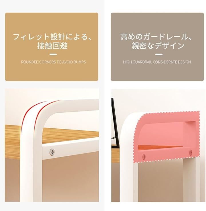 「デザインと素材」頑丈な金属フレームと上質な板材のシンプルな組み合わせは、板材には木質の木目調があり、清潔で明るく、傷に強く、掃除しやすい。