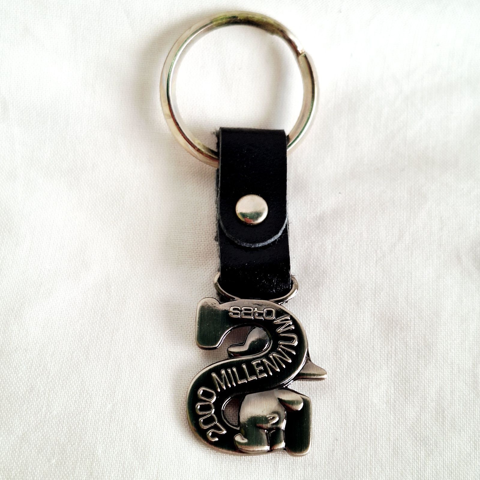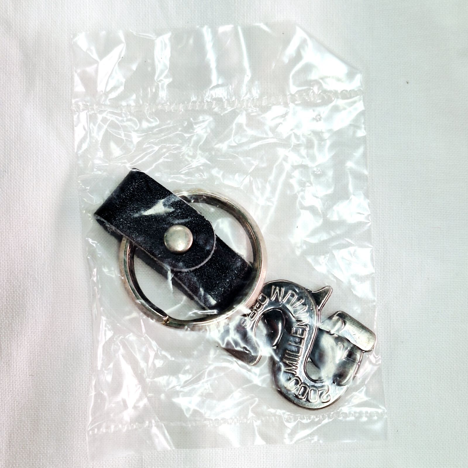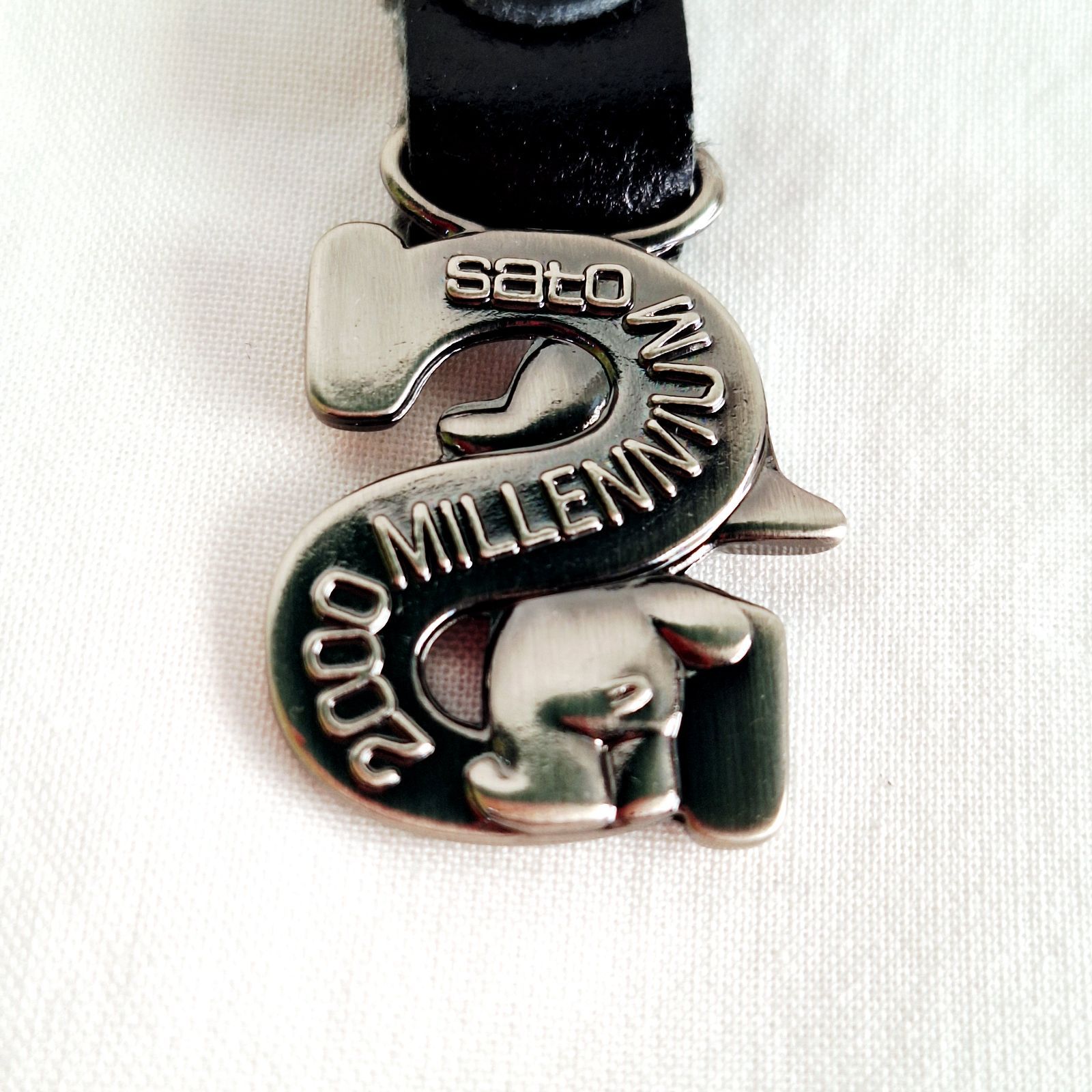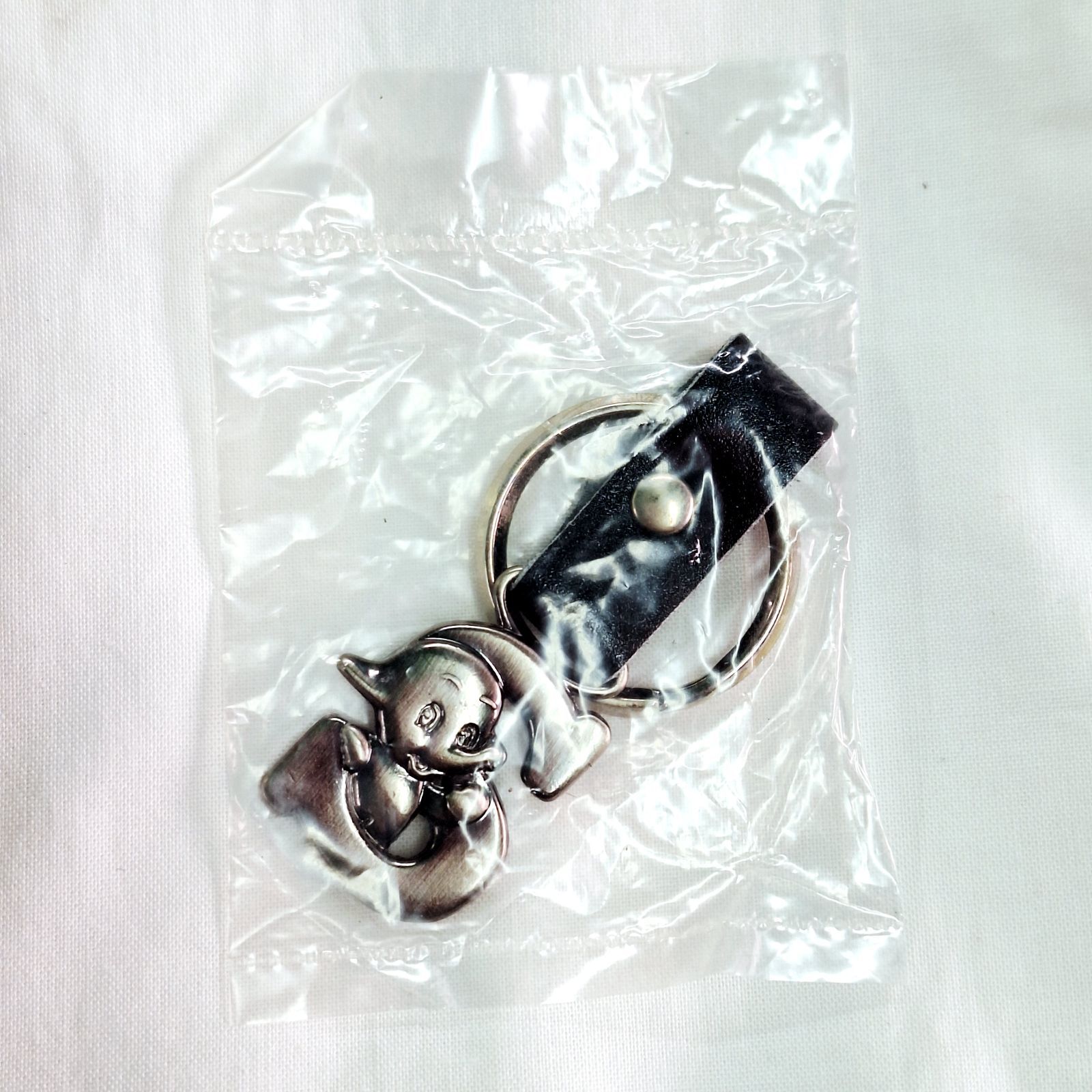 全長8.5cmと小ぶりですが邪魔にならないちょうど良い長さだと思います。レザー調でとてもかっこいいデザインです。発送の際は袋に入った未使用品をお届けします。古いお品物ですのでリングの部分にくすみ等あるかもしれませんが、サトちゃんのメタル部分は在庫分どれも綺麗な状態です。
