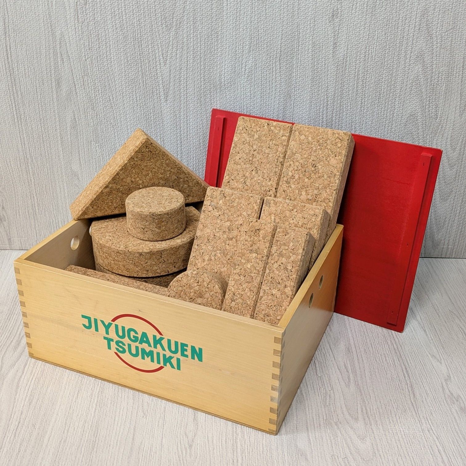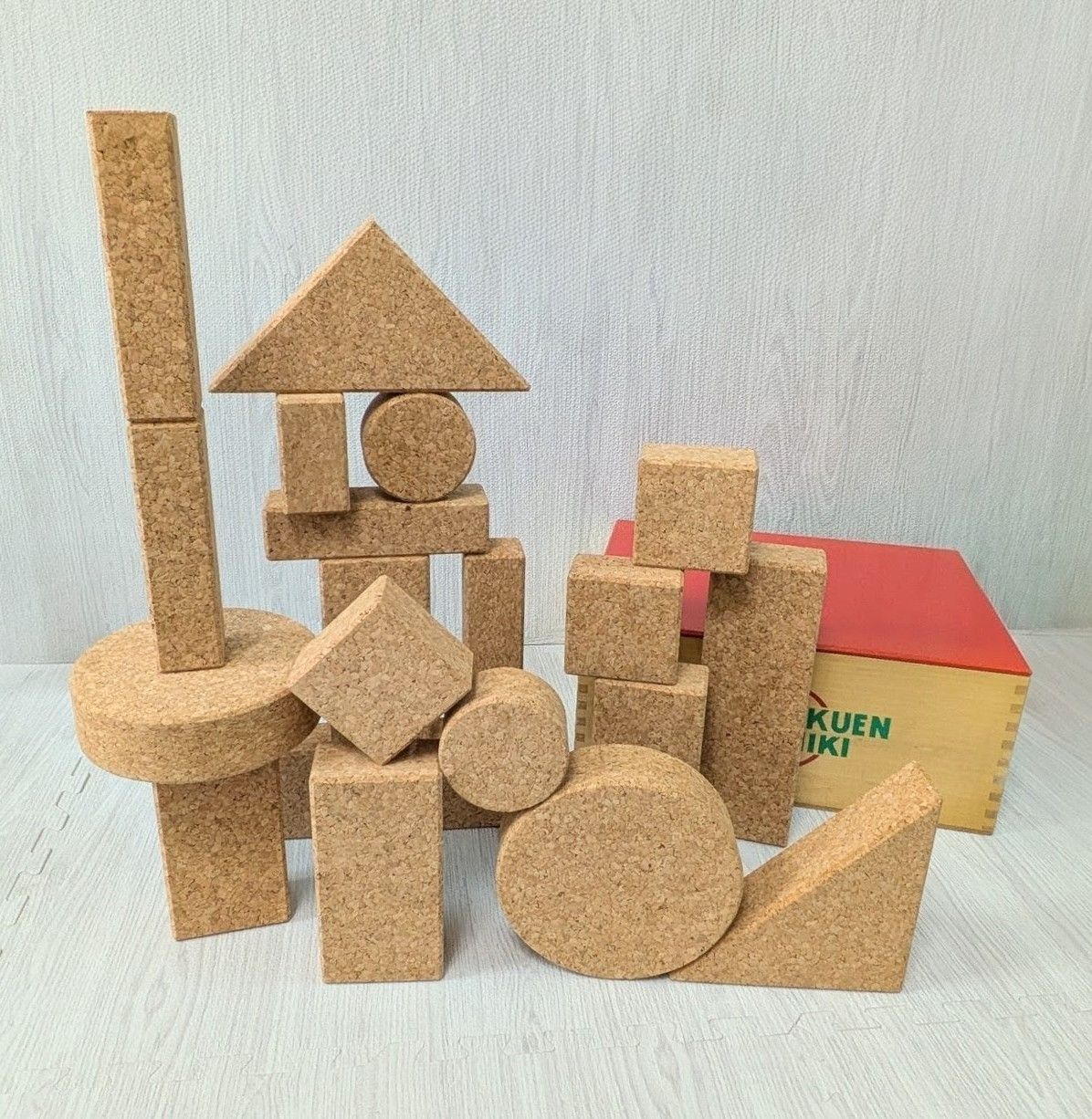 コルクつみきは自由学園生活研究所オリジナルつみきとして1931年にうまれました。一般的な木材に比べ軽く摩擦力も大きいため、斜めに積むことができ、工夫次第で遊び方が広がるつみきです。