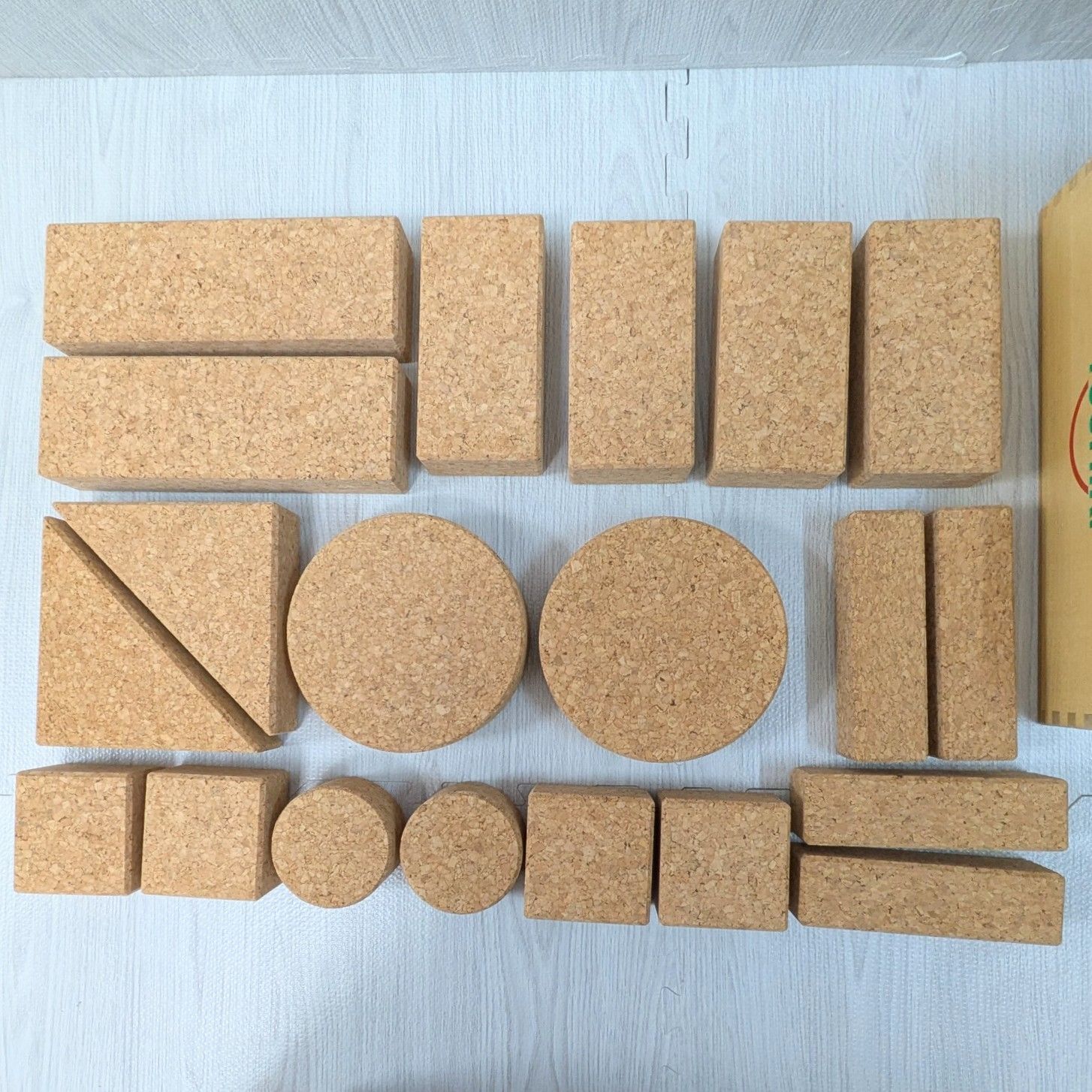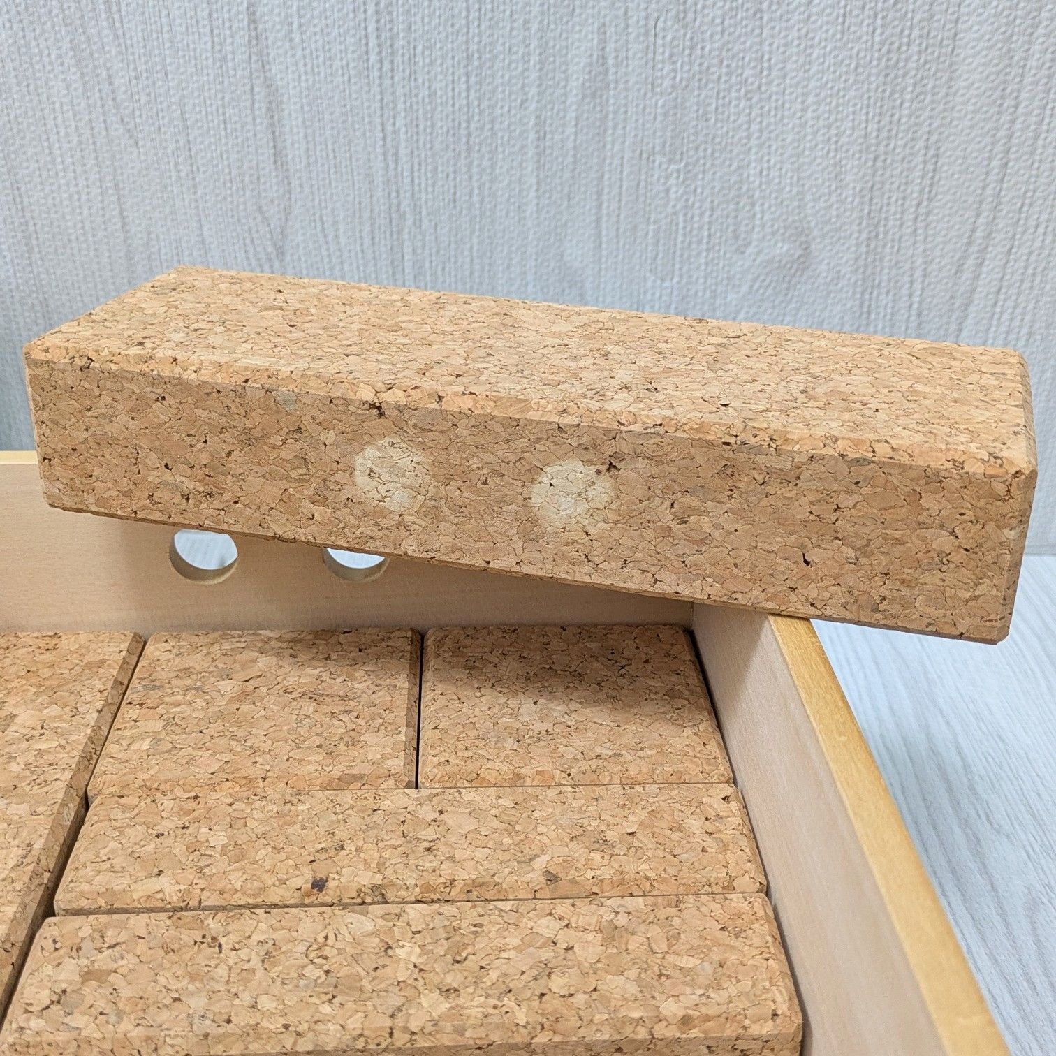 コルクは一般的な木材よりクッション性があるため、崩したり落としたりしても衝撃や音が小さいのが特徴です。自然の木のやさしい質感はお子様でもにぎりやすく安心して遊べます。