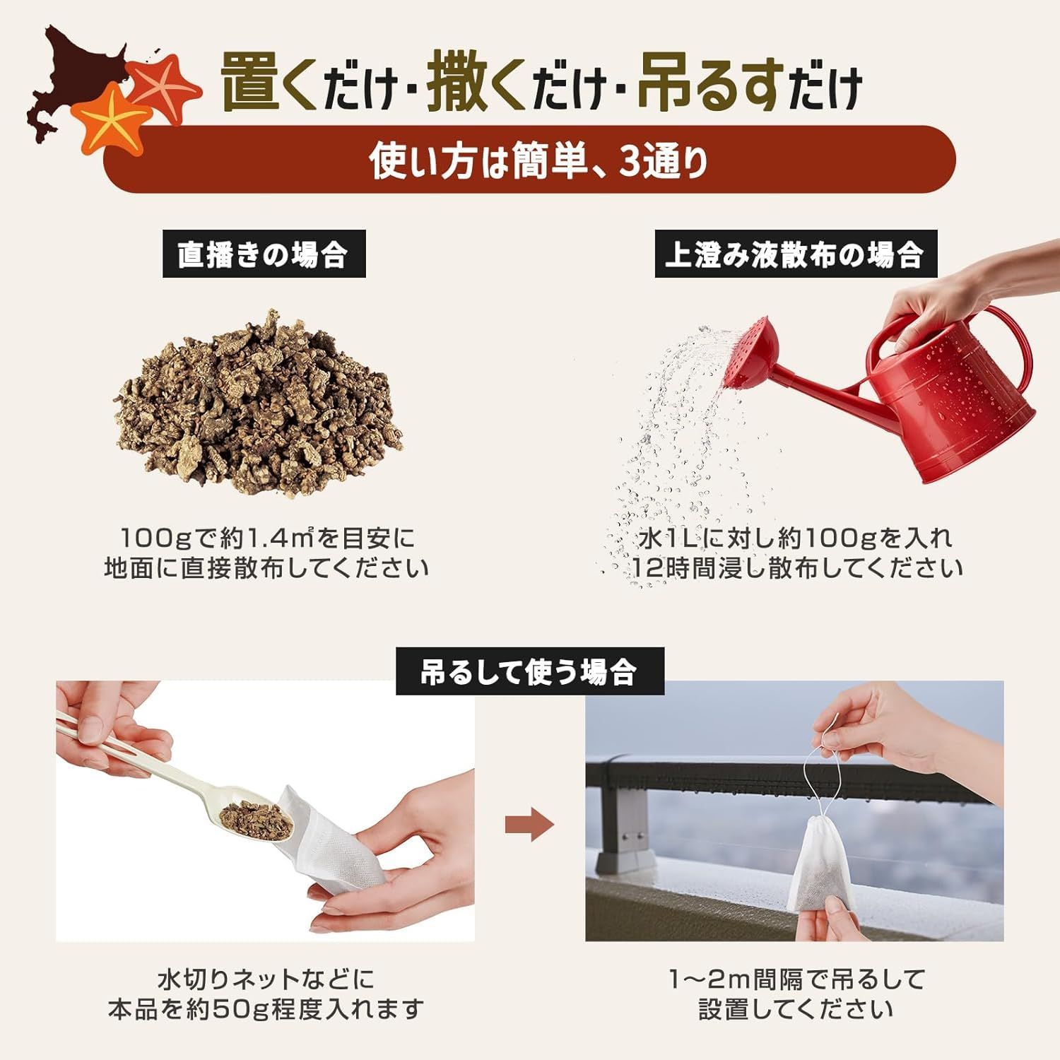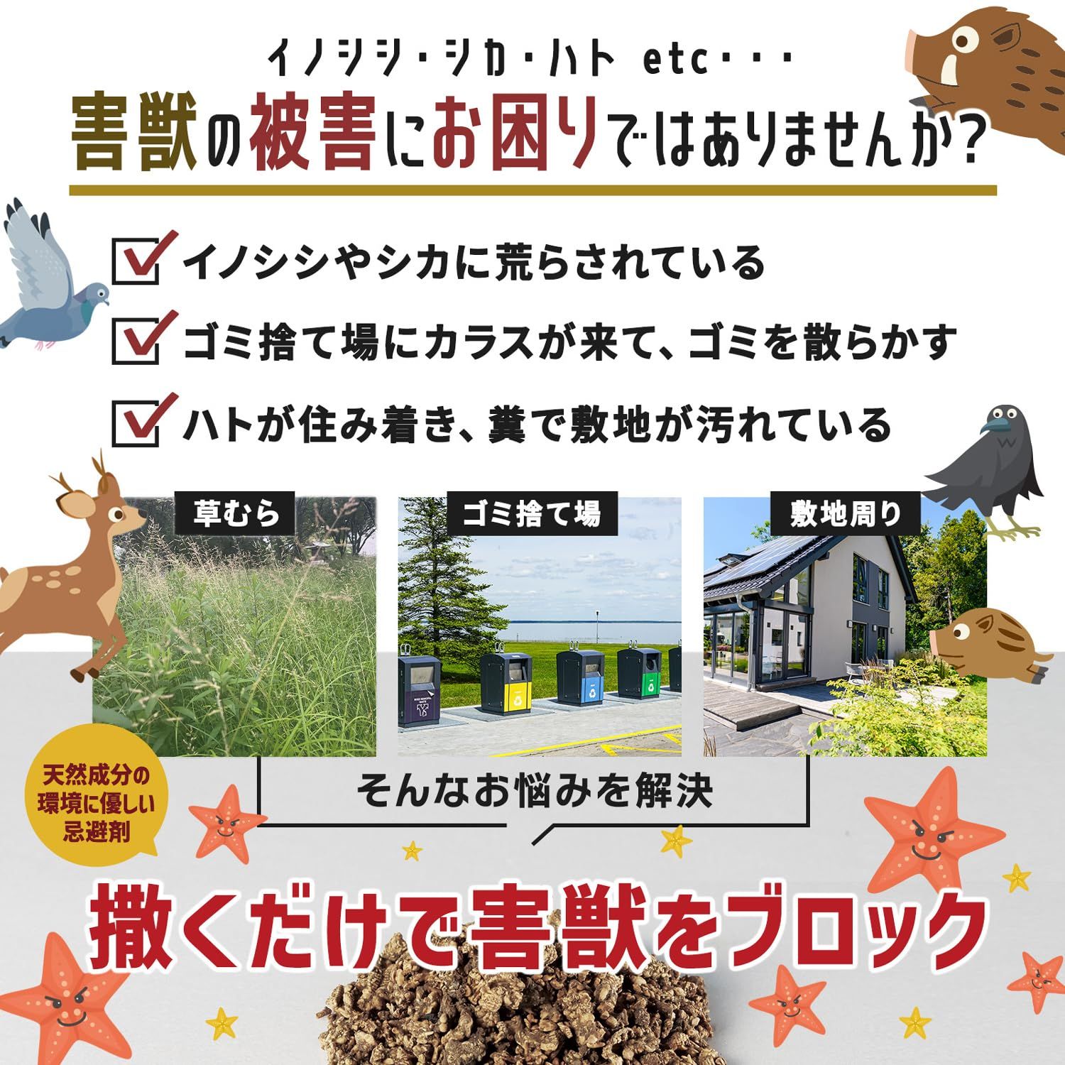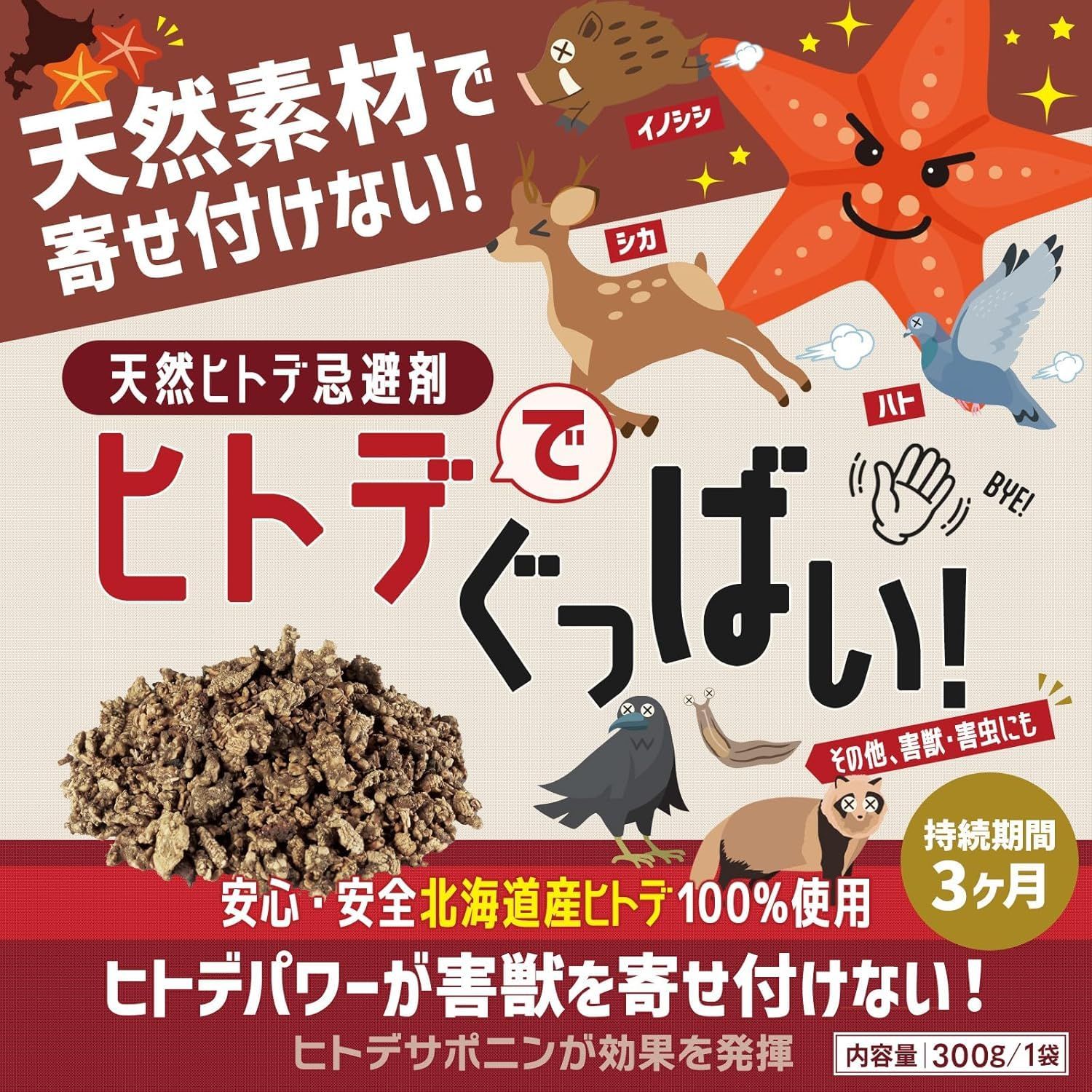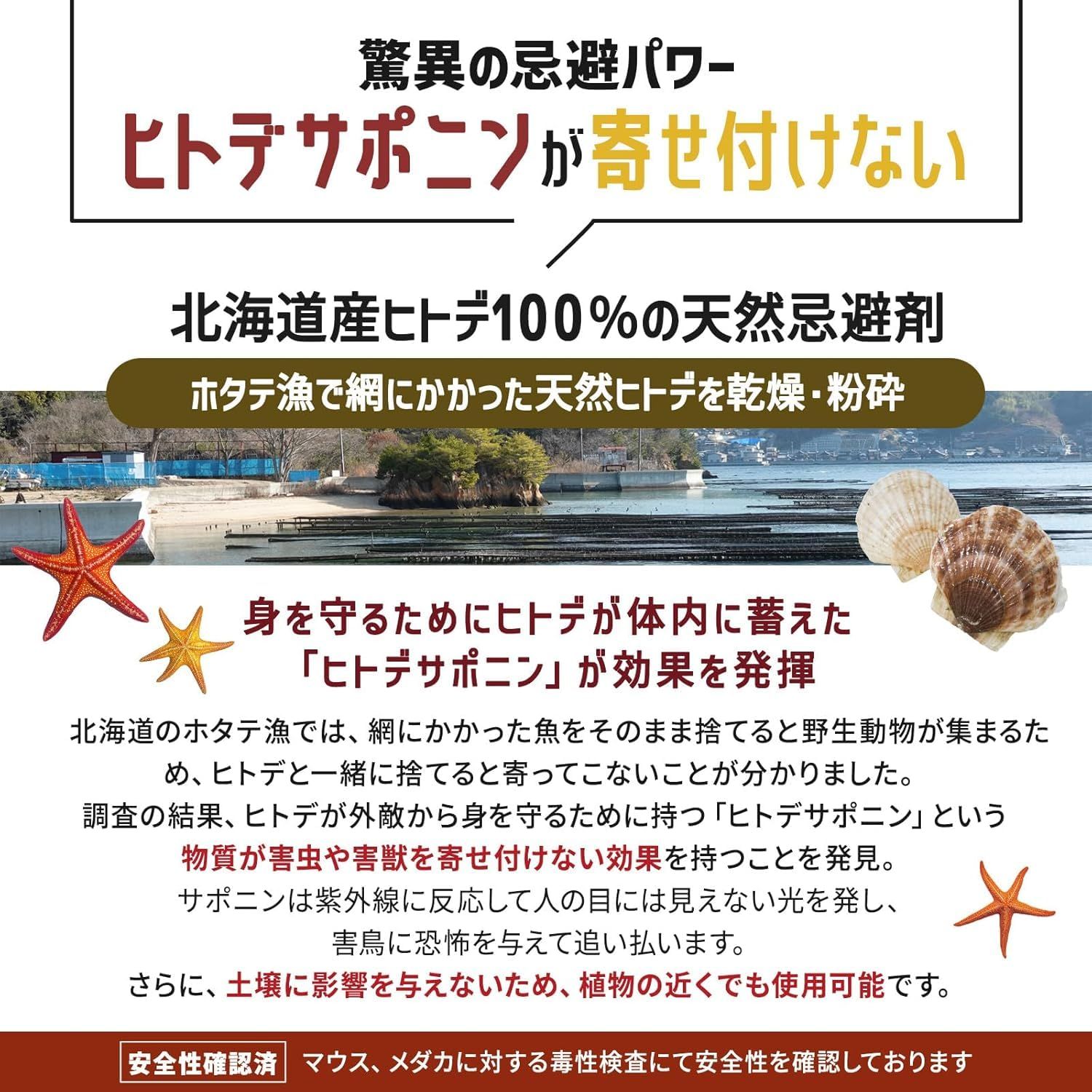 【化学薬品不使用!安心して使える害獣よけ】 天然成分のみを使用した忌避剤なので、化学薬品不使用でペットやお子様がいる環境でも安心。ただし、水に濡れたまま放置するとヒトデ忌避剤の効果が失われ、腐敗による悪臭が発生する可能性があるため、乾燥した状態で適切に管理してください。