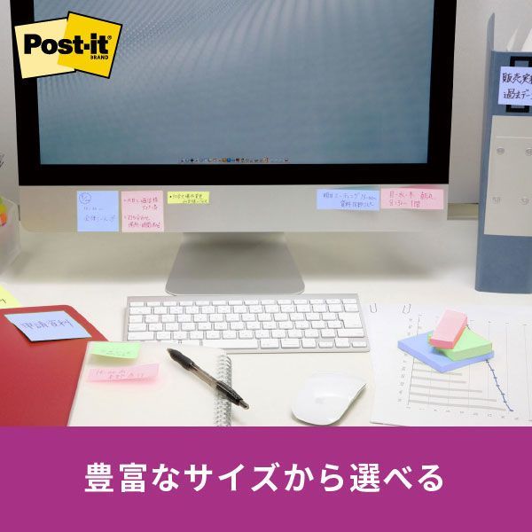 ○2倍の粘着力でしっかり貼れる強粘着ふせん。パソコンやファイルなどの樹脂面にも、くり返し貼ってはがせる。よく目立つネオンカラー。(ポストイット通常粘着製品比)