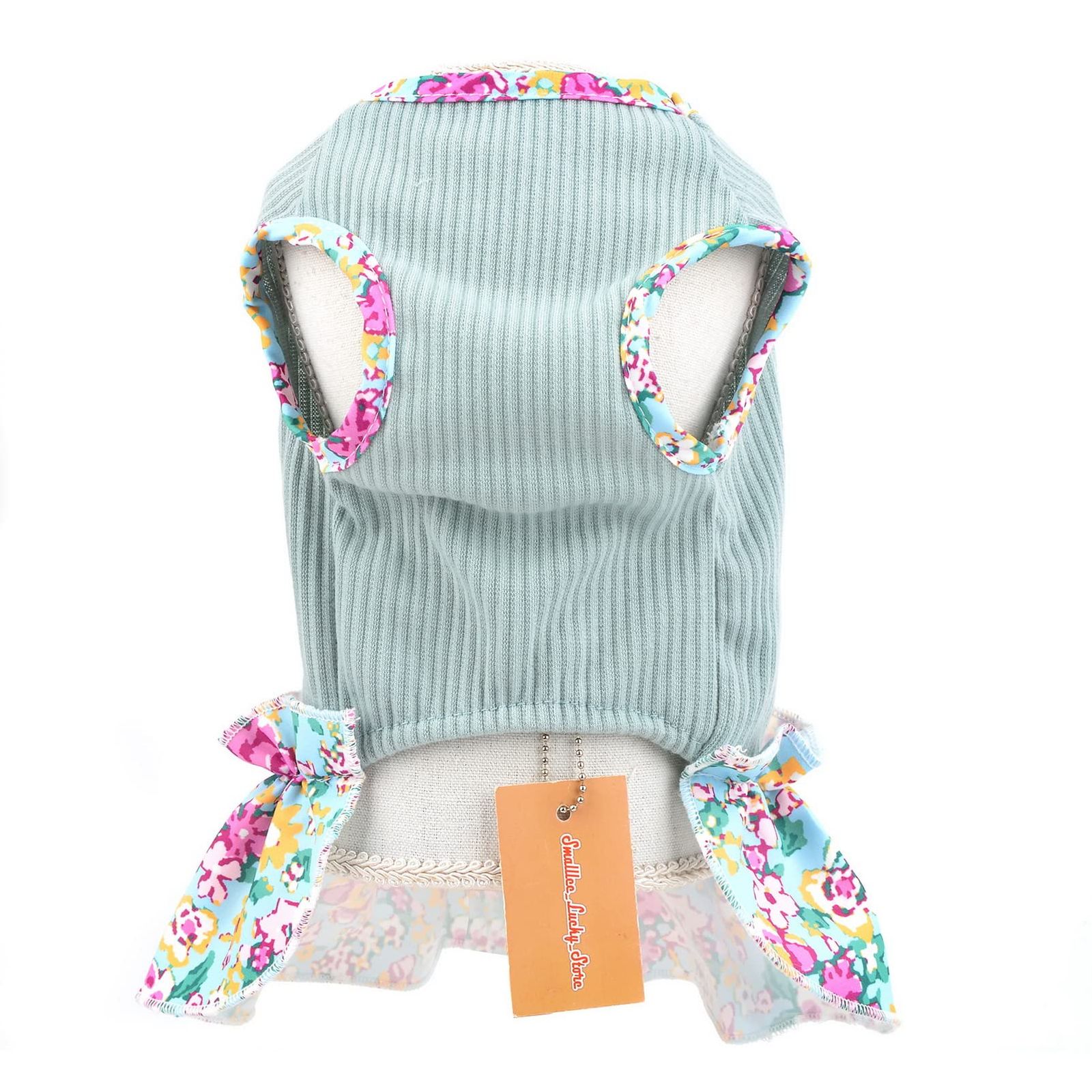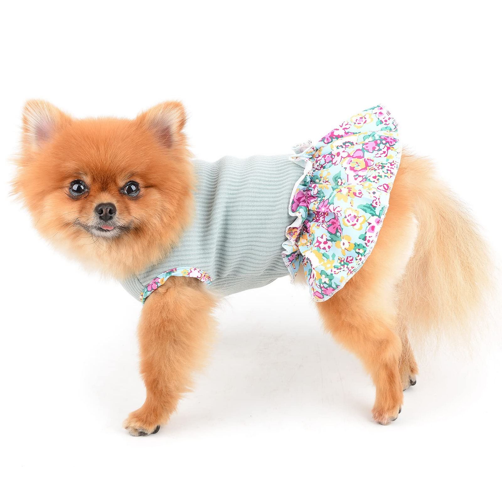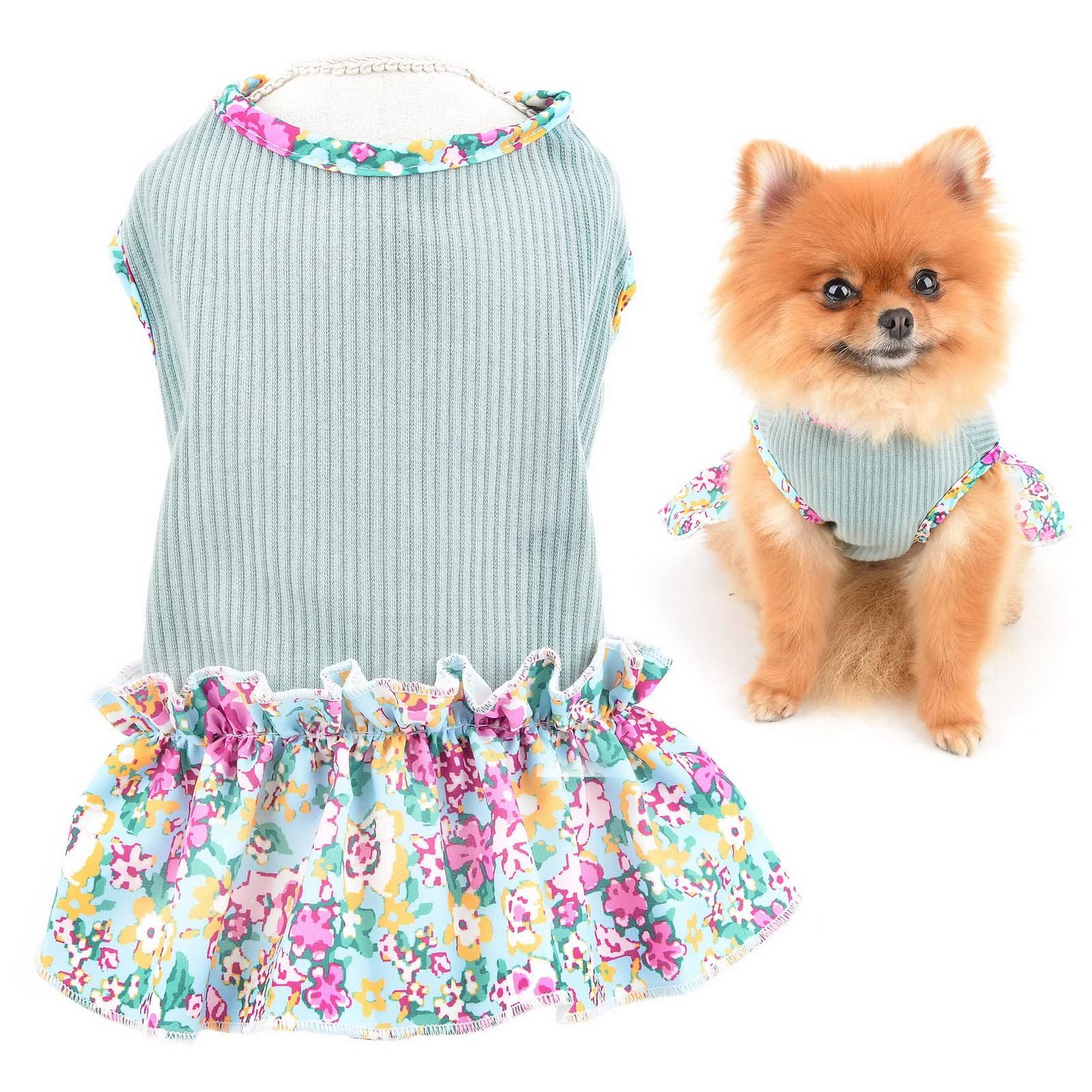 SMALLLEE_LUCKY_STORE 犬服 小型犬 春夏 ニット花柄 ワンピース お姫様 簡単着脱 女の子猫服 洋服,グリーン,M