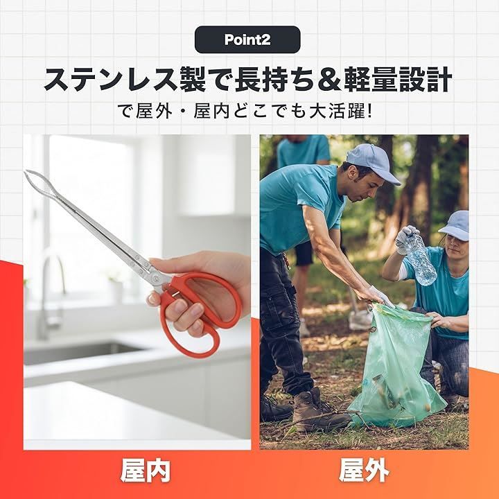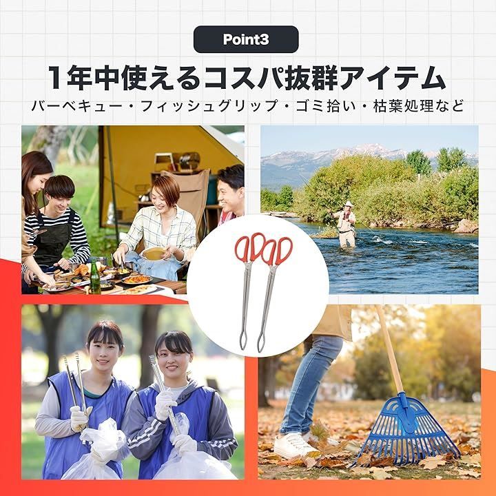 バーベキュー、キャンプの炭・ひばさみ、魚介処理用のフィッシュグリップ、玄関周りの清掃、公園や職場のごみ拾い、害虫駆除など衛生的な作業にも最適。