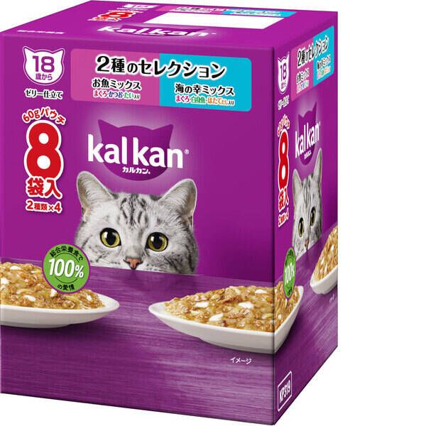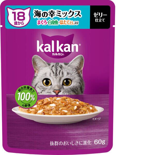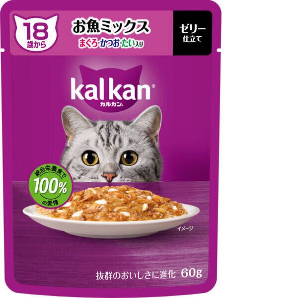 ●まぐろ・かつお・たい入り、まぐろ・白身魚・ほたてだし入りは、厳選された素材をカルカン特製だしで煮込み、ジューシーなゼリー仕立てにしました。