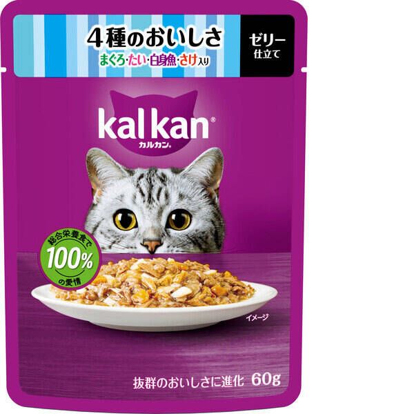 ●まぐろ・たい・かにかま・ささみ入り、まぐろ・たい・白身魚・さけ入りは、厳選された素材をカルカン特製だしで煮込み、ジューシーなゼリー仕立てにしました。