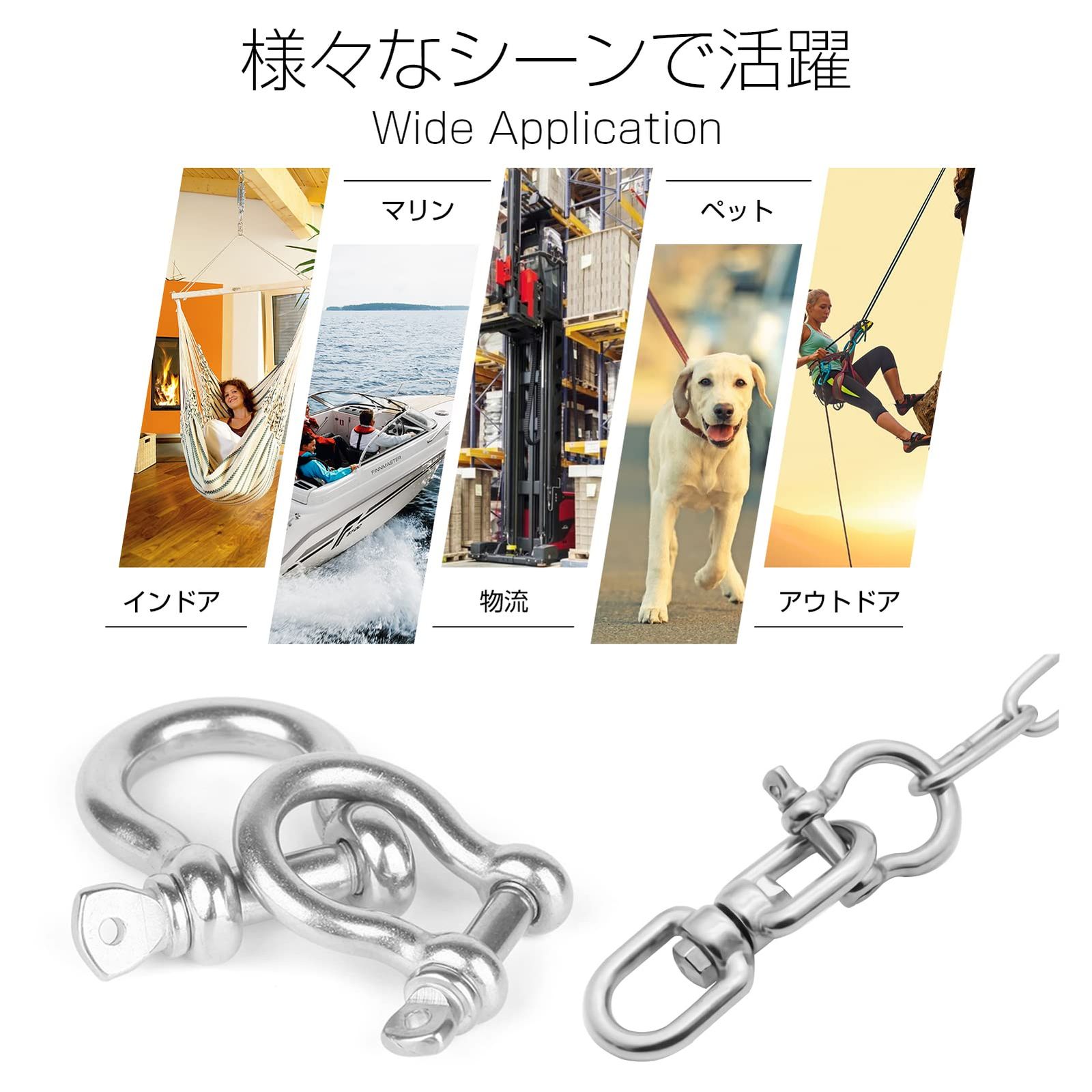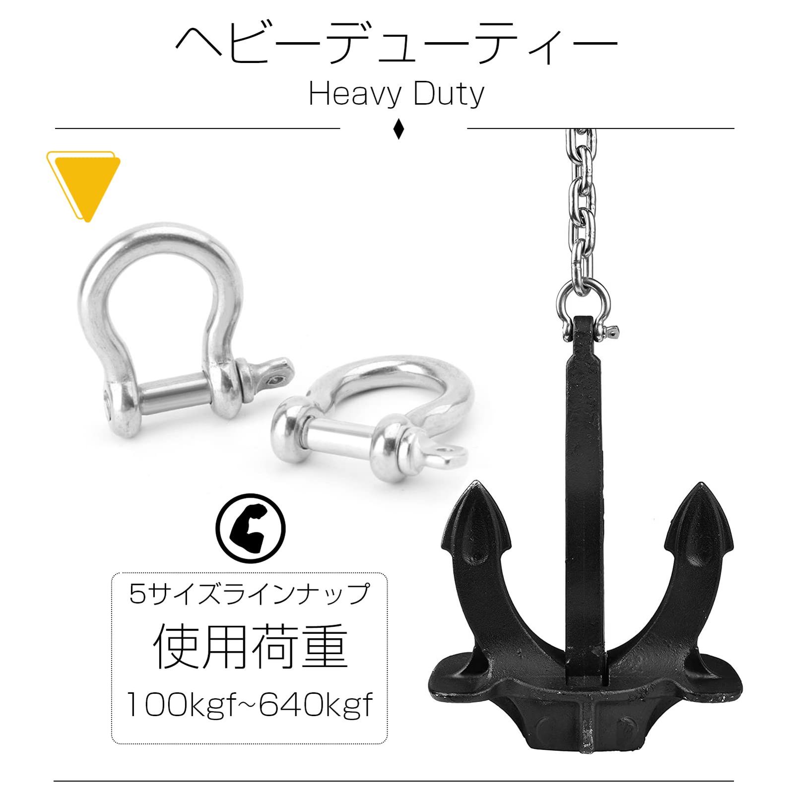 [用途]計5サイズラインナップ、使用荷重は100kgf~640kgf。ステンレスシャックルはインドア、物流、航海、アウトドアスポーツなど様々なシーンでロープやワイヤレス、チェーンやスイベルの連結金具として活躍できます。