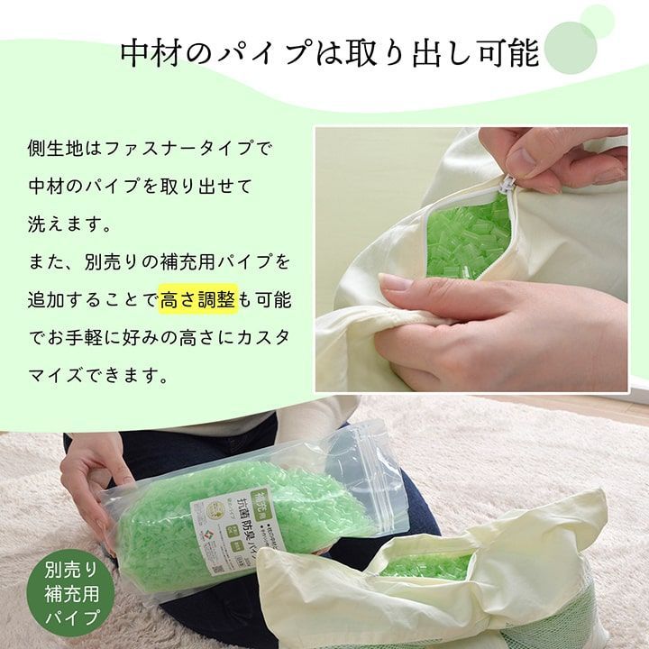 ヒバエッセンス練り込みパイプを使用しています。青森県のヒバの木から抽出した「ヒバエッセンス」をメーカー独自の技術でパイプに加工しました。ヒバエッセンスにはヒノキチオールという、天然物質では極めて抗菌性の高い成分が含まれています。(無加工品に比べ、抗菌・防臭効果があります。)ヒバエッセンスで安らかな森の眠りをご提案します。パイプ使用のため、通気性がよく、熱がこもらず心地よくご使用できます。ファスナー式で中材(パイプ)の交換、高さ(量)の調節が可能です。ご家庭で簡単にパイプが洗えます。