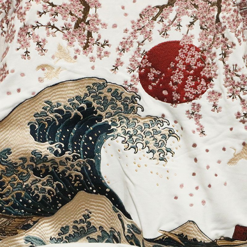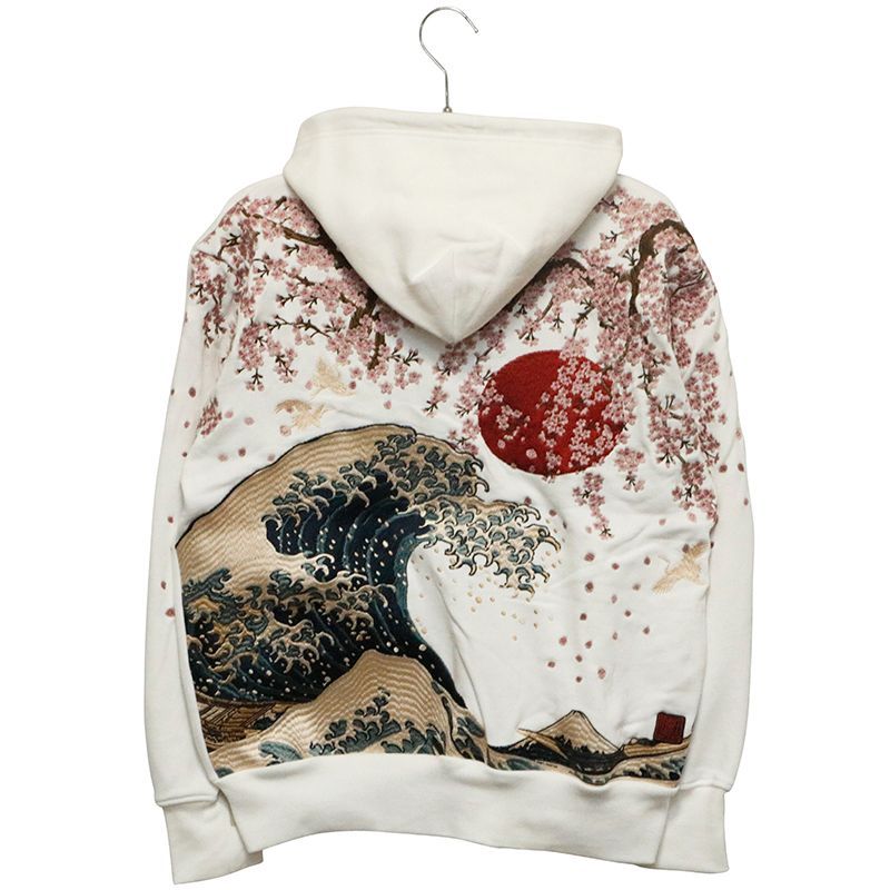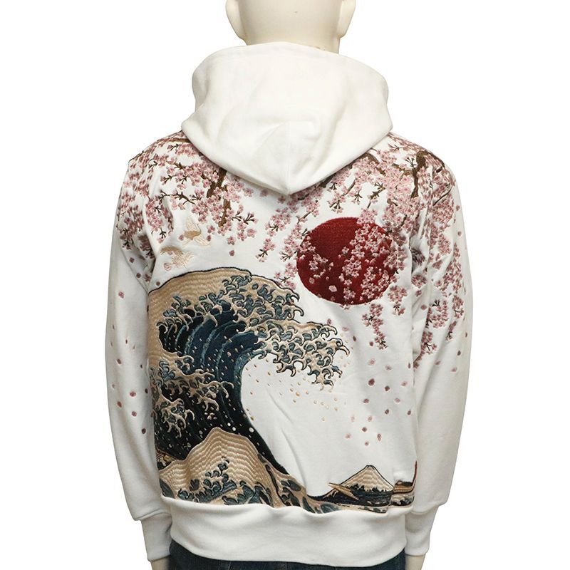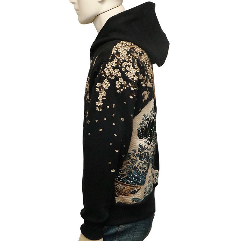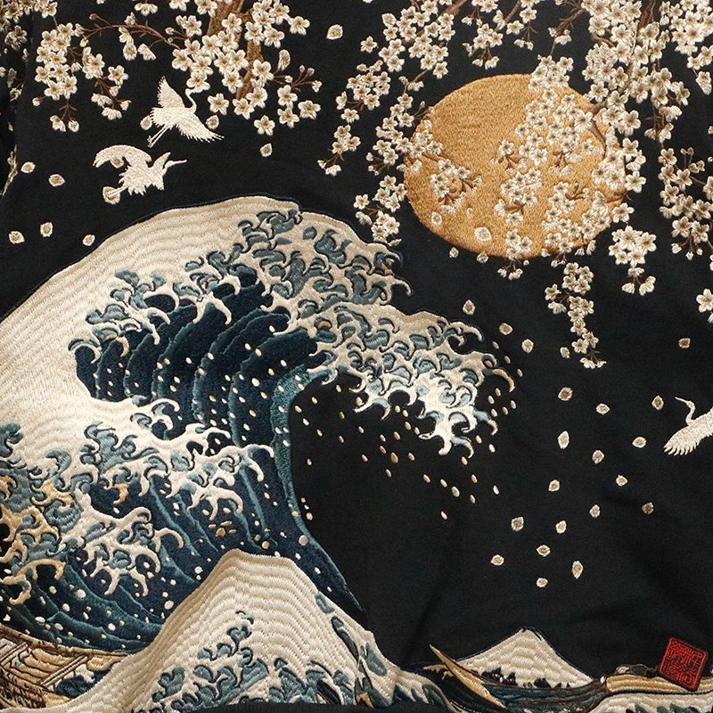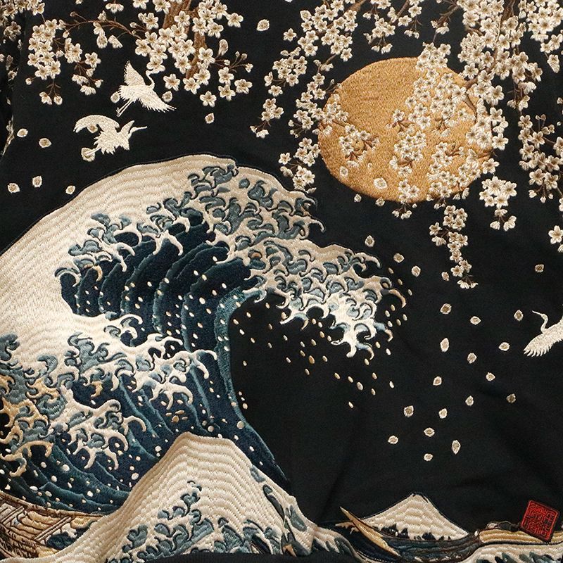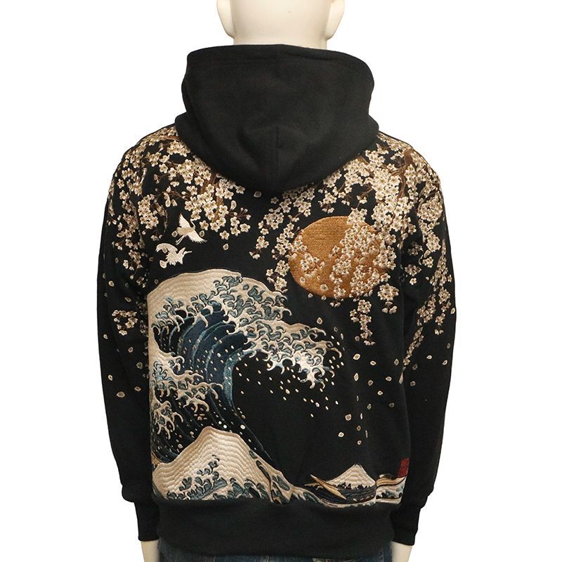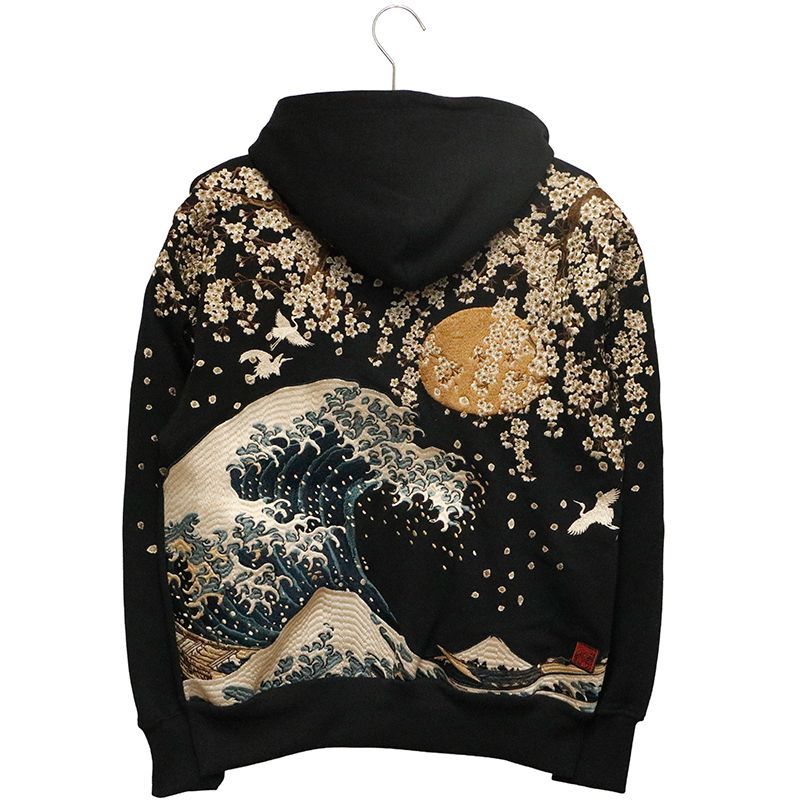 葛飾北斎の「富嶽三十六景」の「神奈川沖浪裏」をモチーフに桜や鳥などを加え迫力ある構図を刺繍で落とし込んだ和柄パーカー。