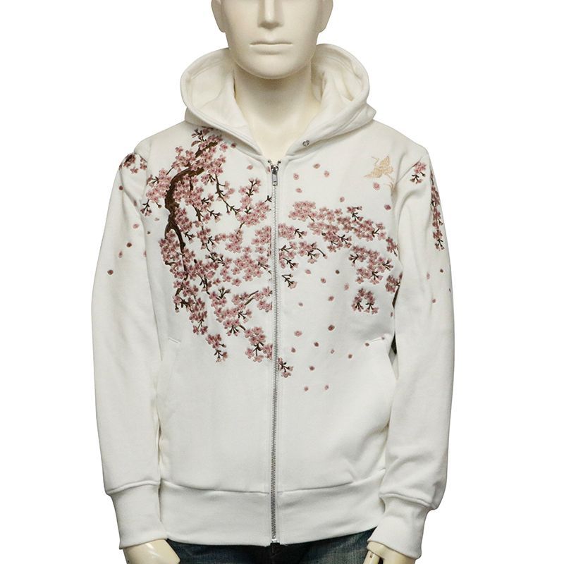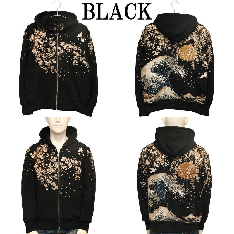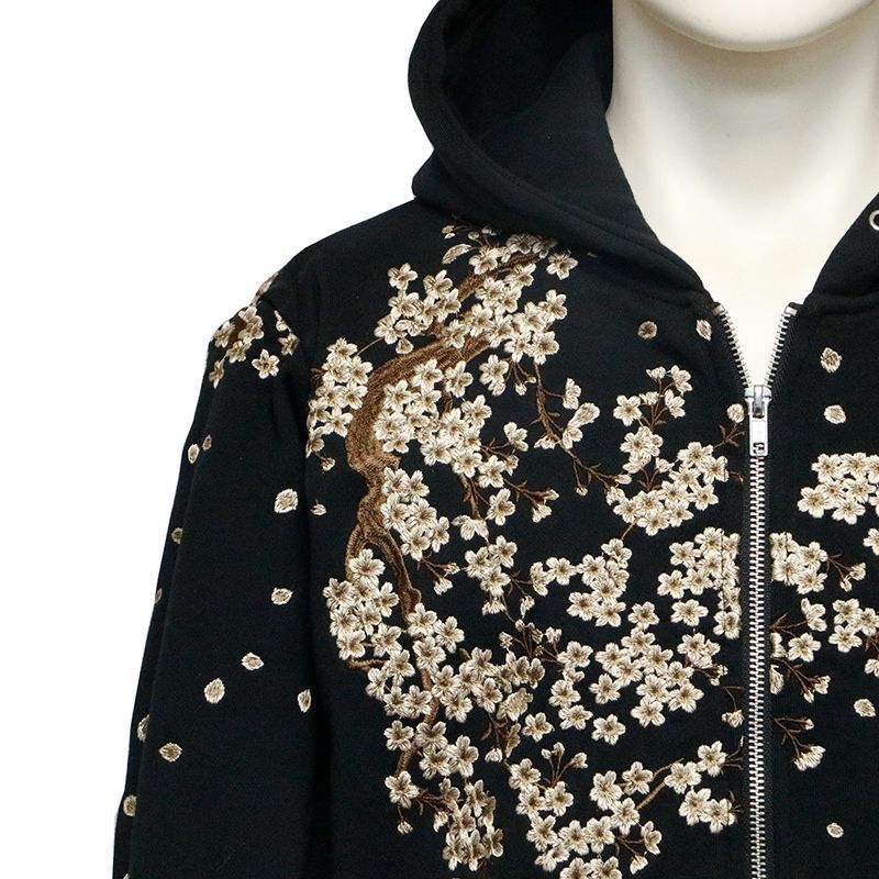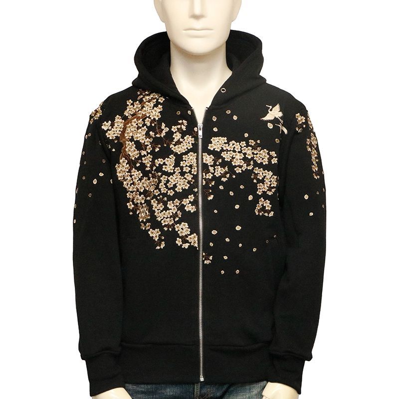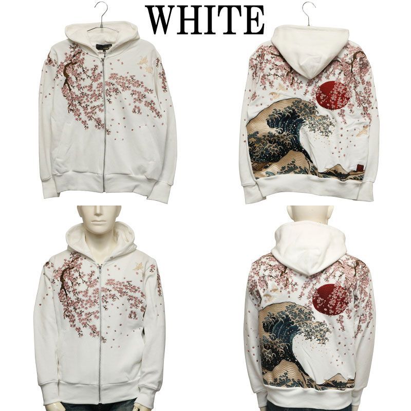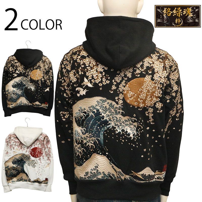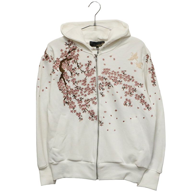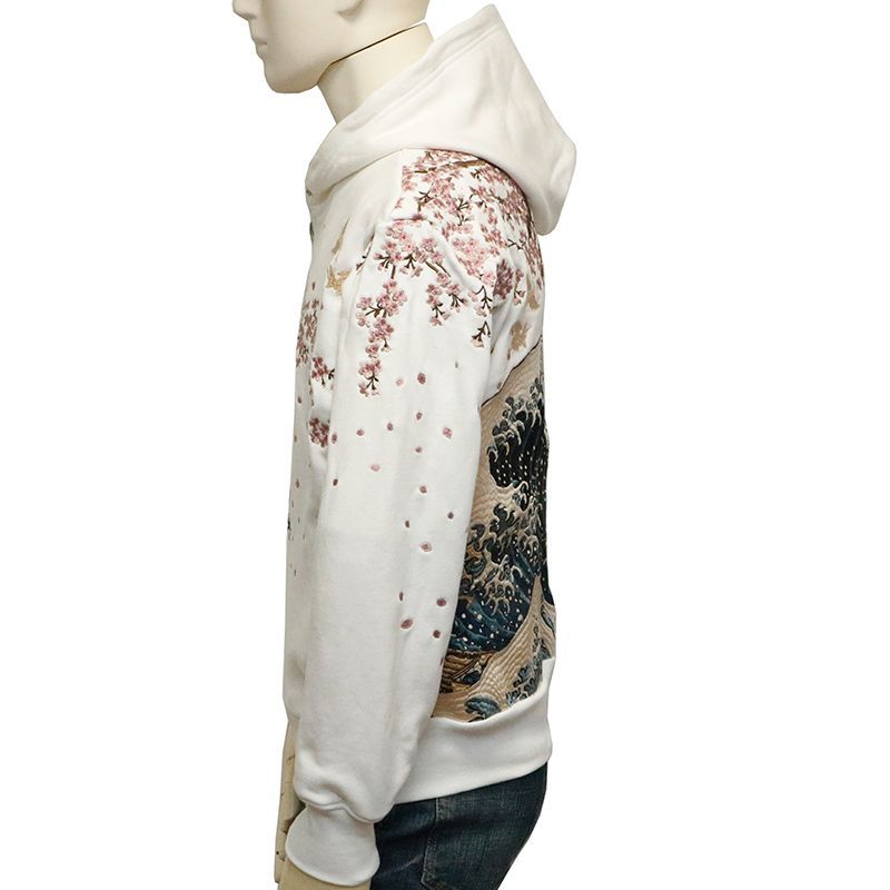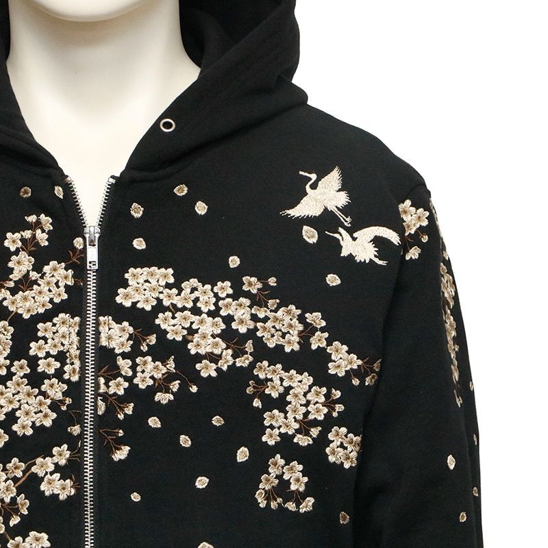 葛飾北斎の「富嶽三十六景」の「神奈川沖浪裏」をモチーフに桜や鳥などを加え迫力ある構図を刺繍で落とし込んだ和柄パーカー。
