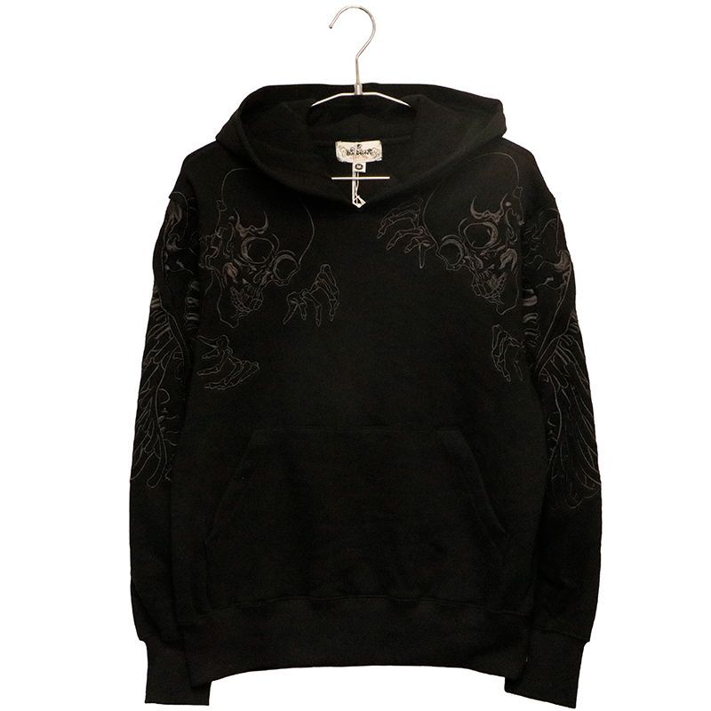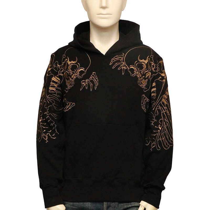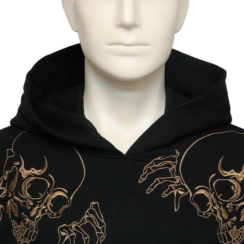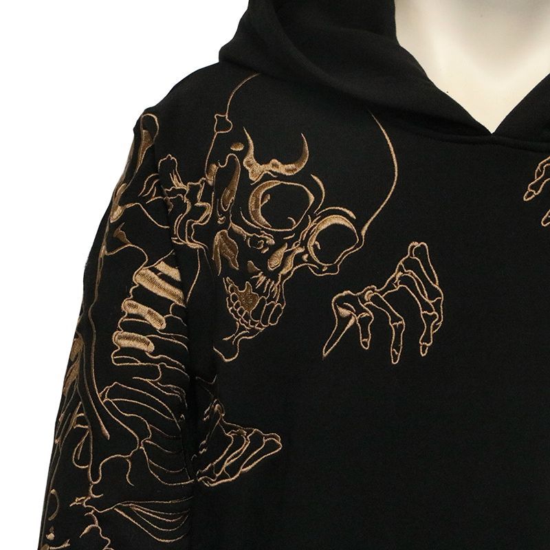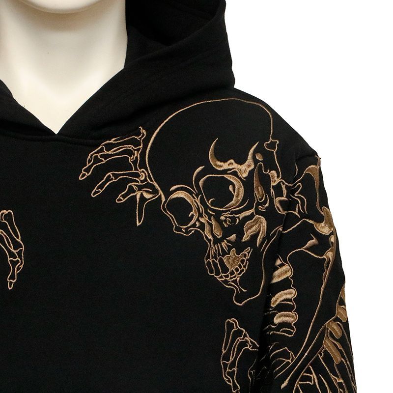 両肩にがしゃ髑髏を刺繍したプルパーカー。